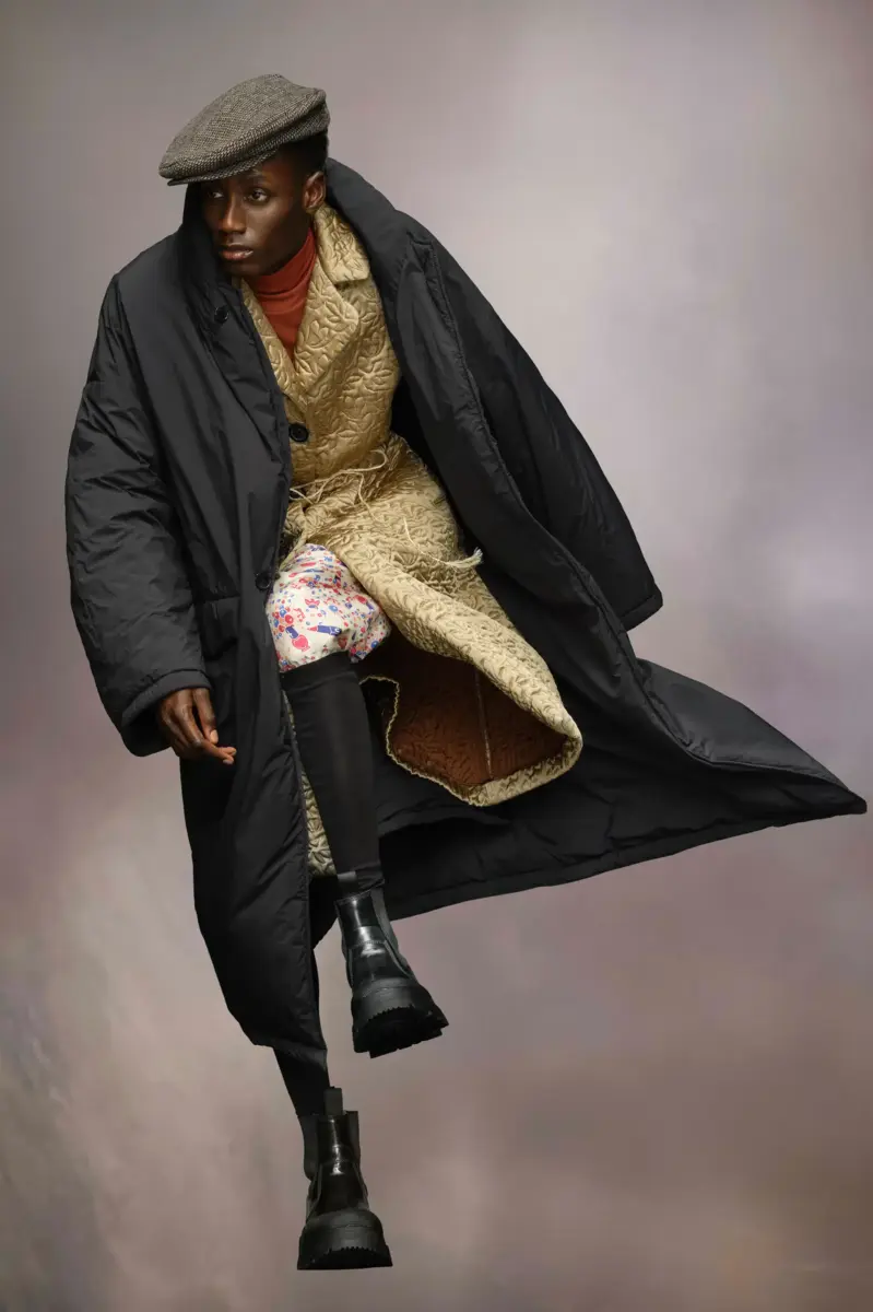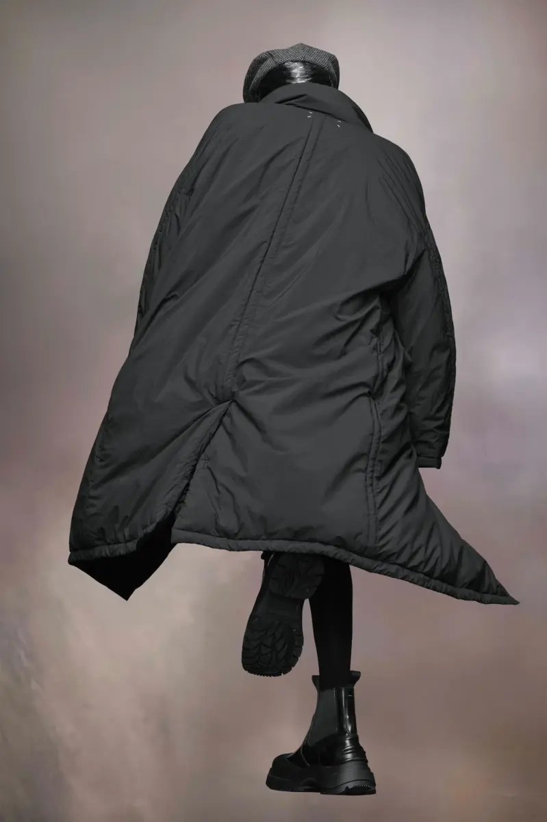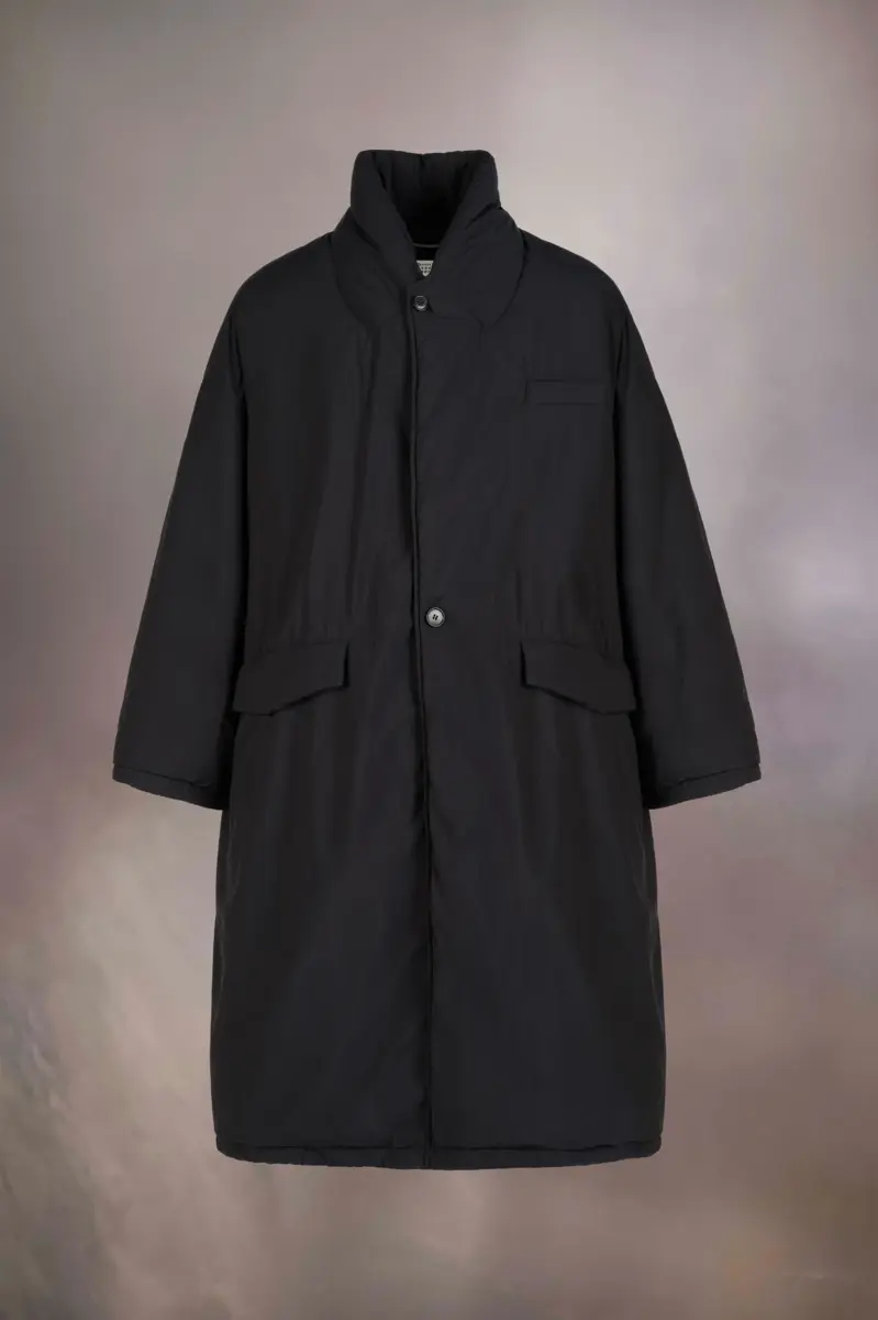 This mid-length oversized padded coat is made from recycled fabric with a stand collar and a back vent. Maison Margiela’s signature, the four white stitches, appear at the back; the opposite of a label.