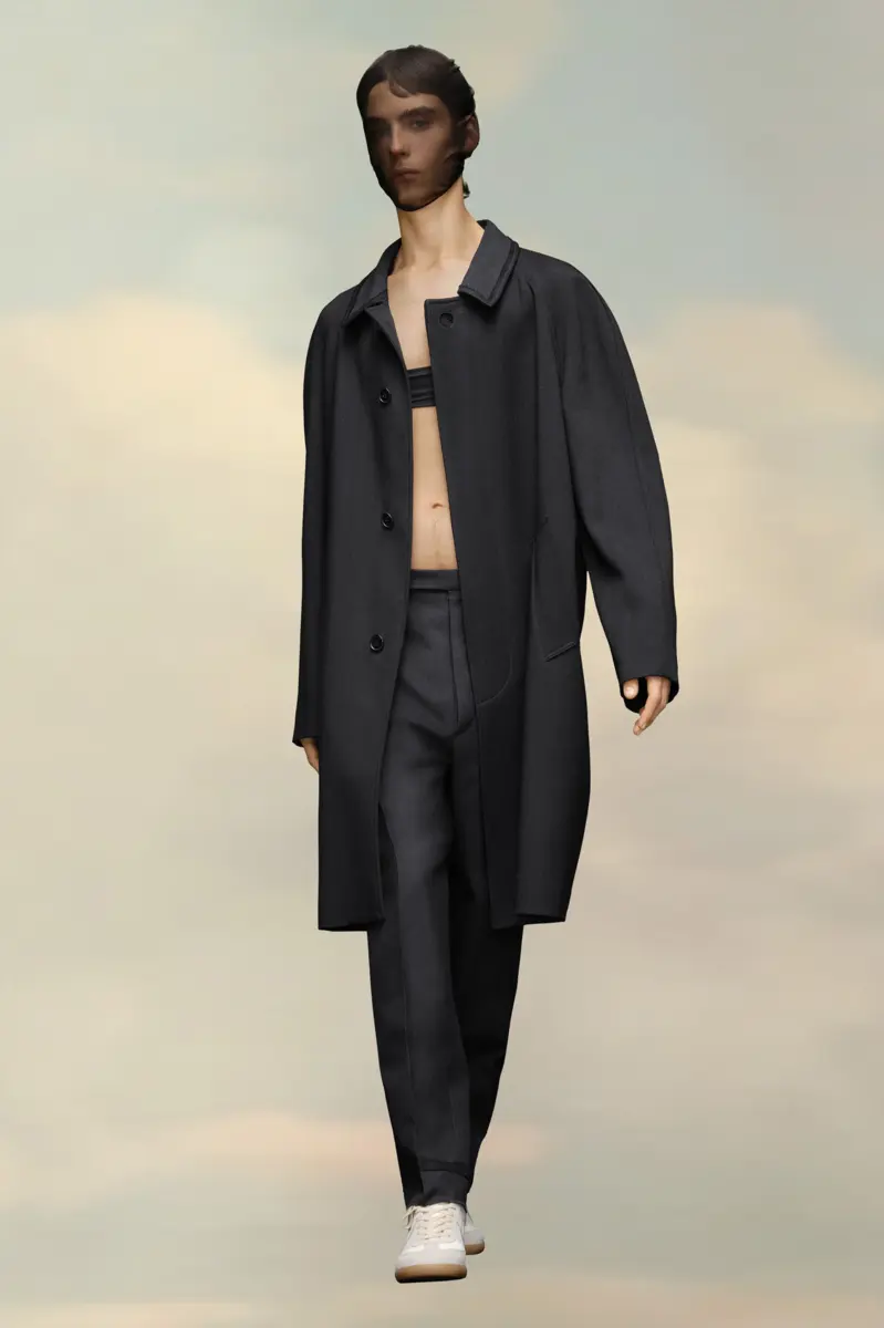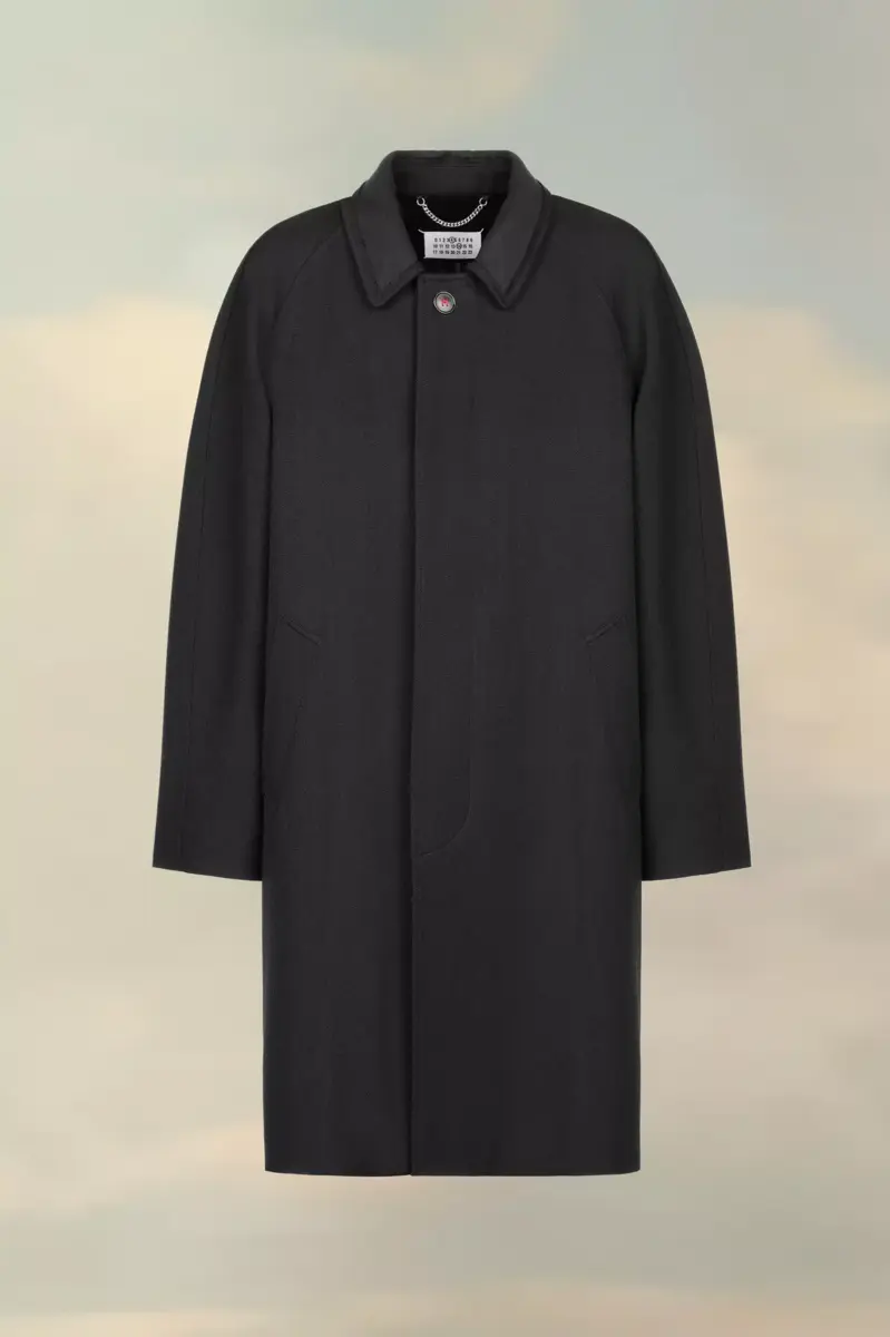 Crafted from wool viscose, the coat features a contrast collar and a button at the top with a hidden placket for a clean aspect. A single vent finishes the design. Maison Margiela’s signature, the four stitches, appear at the back; the opposite of a label.
