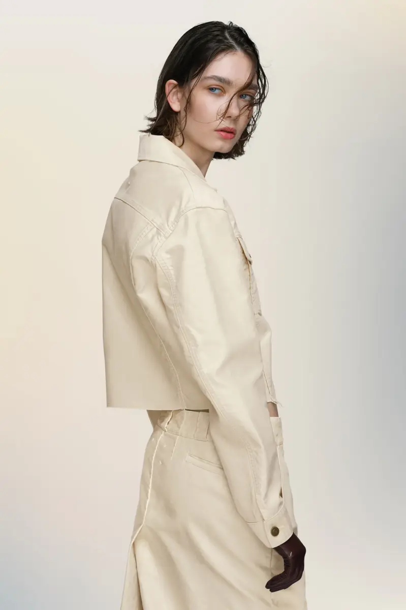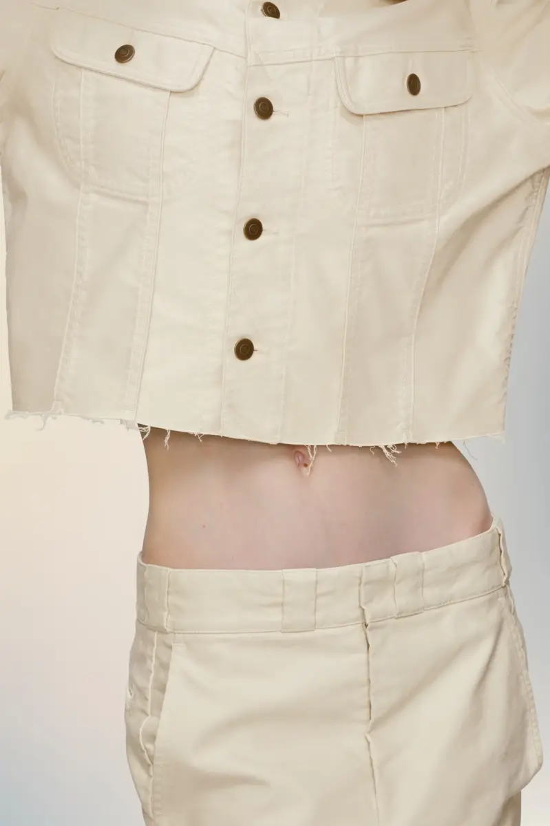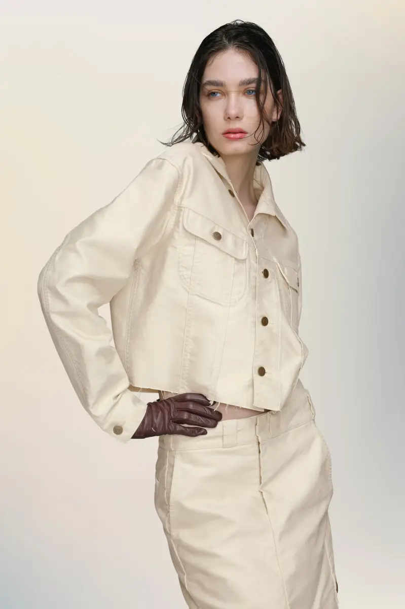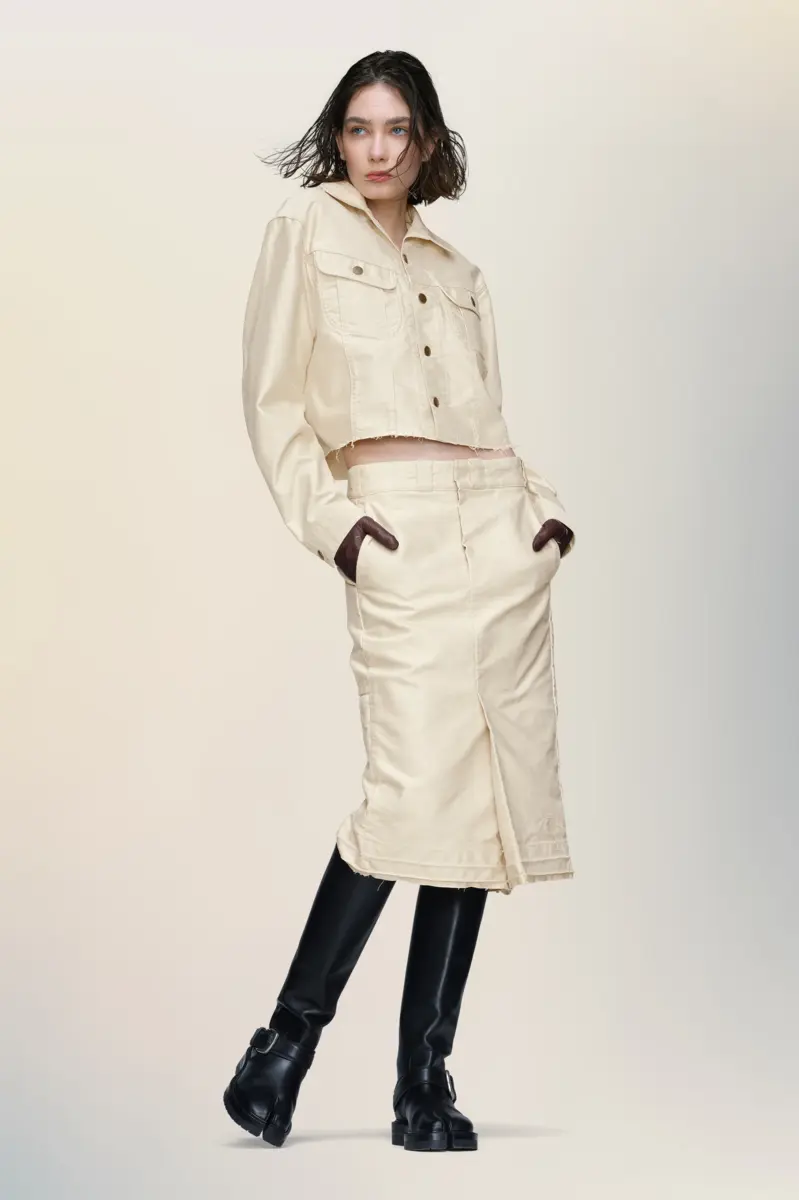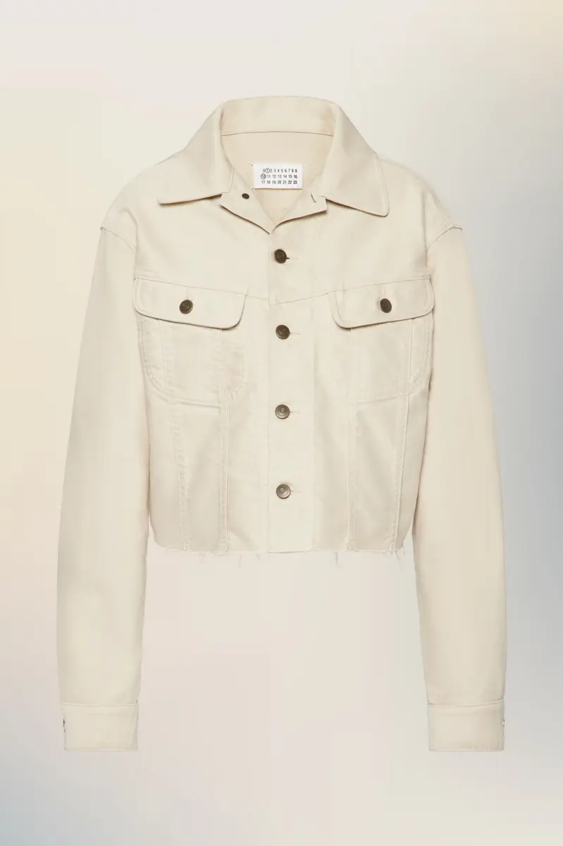 Cut in cotton moleskin, this cropped jacket distils the Maison’s deconstructive approach into a concise silhouette. Raw hems and visible seams reinterpret classic workwear through altered proportion and minimal finish. Maison Margiela’s signature, the four stitches, appear at the back; the opposite of a label.