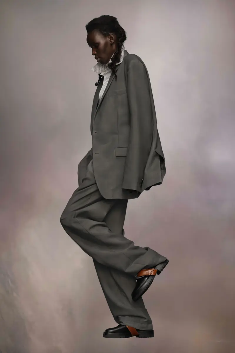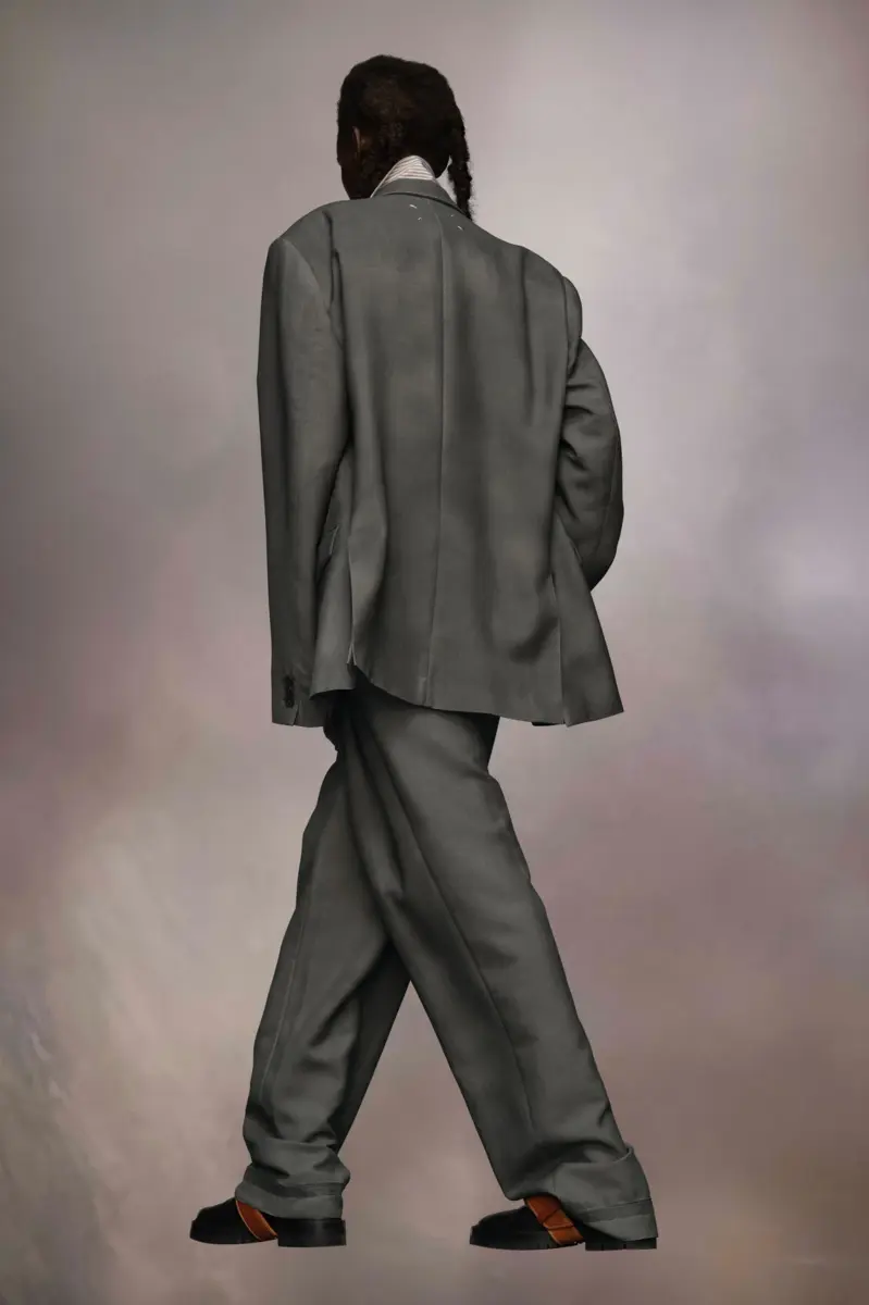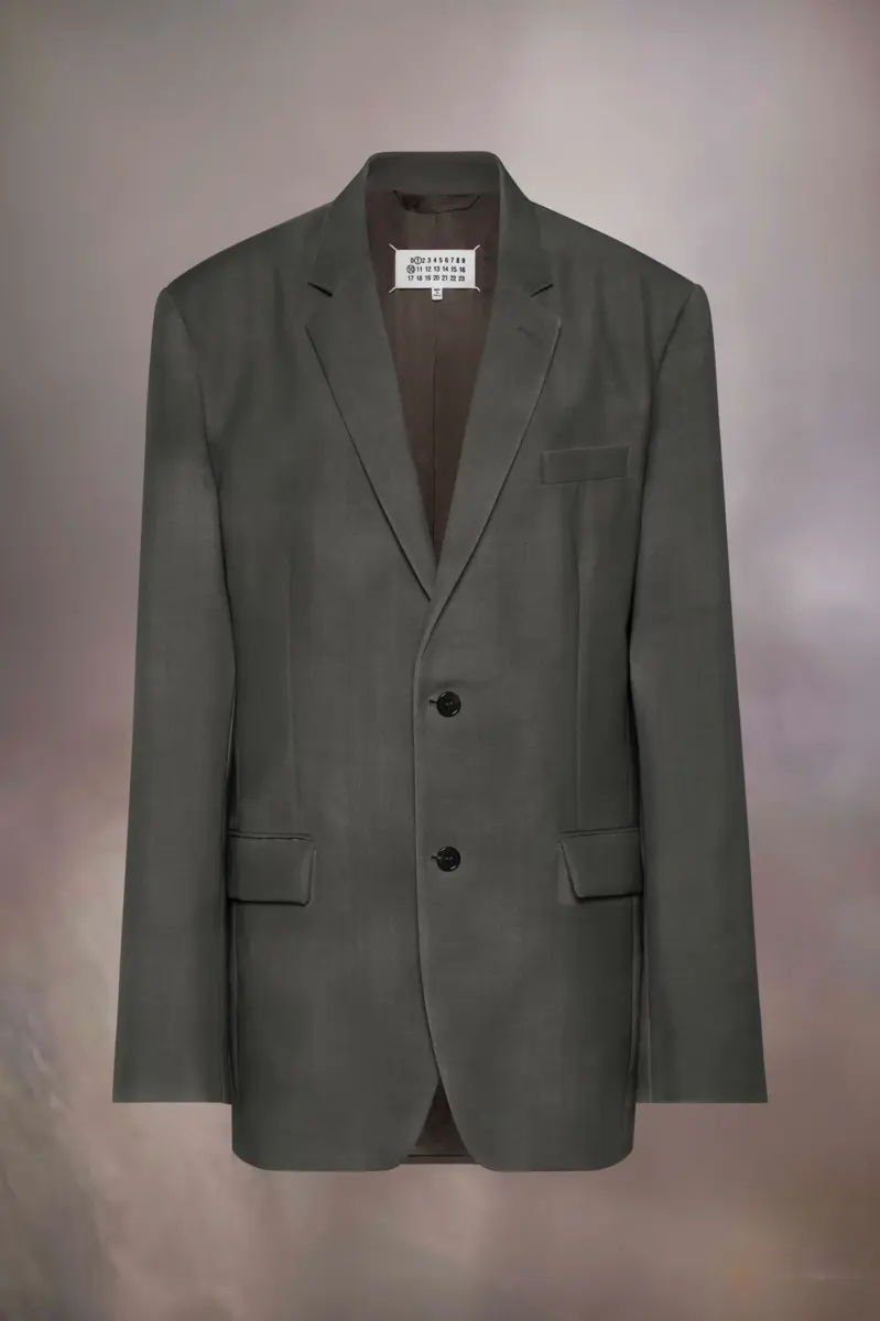 The notched collar blazer comes in a wool mohair blend with hand-applied greasy patina technique for a worn, uneven finish. With a single-breasted closure, the jacket is finished with a chest pocket, flap pockets and comes without a back vent for a clean silhouette. Maison Margiela’s signature, the Four stitches, appear at the back; the opposite of a label.