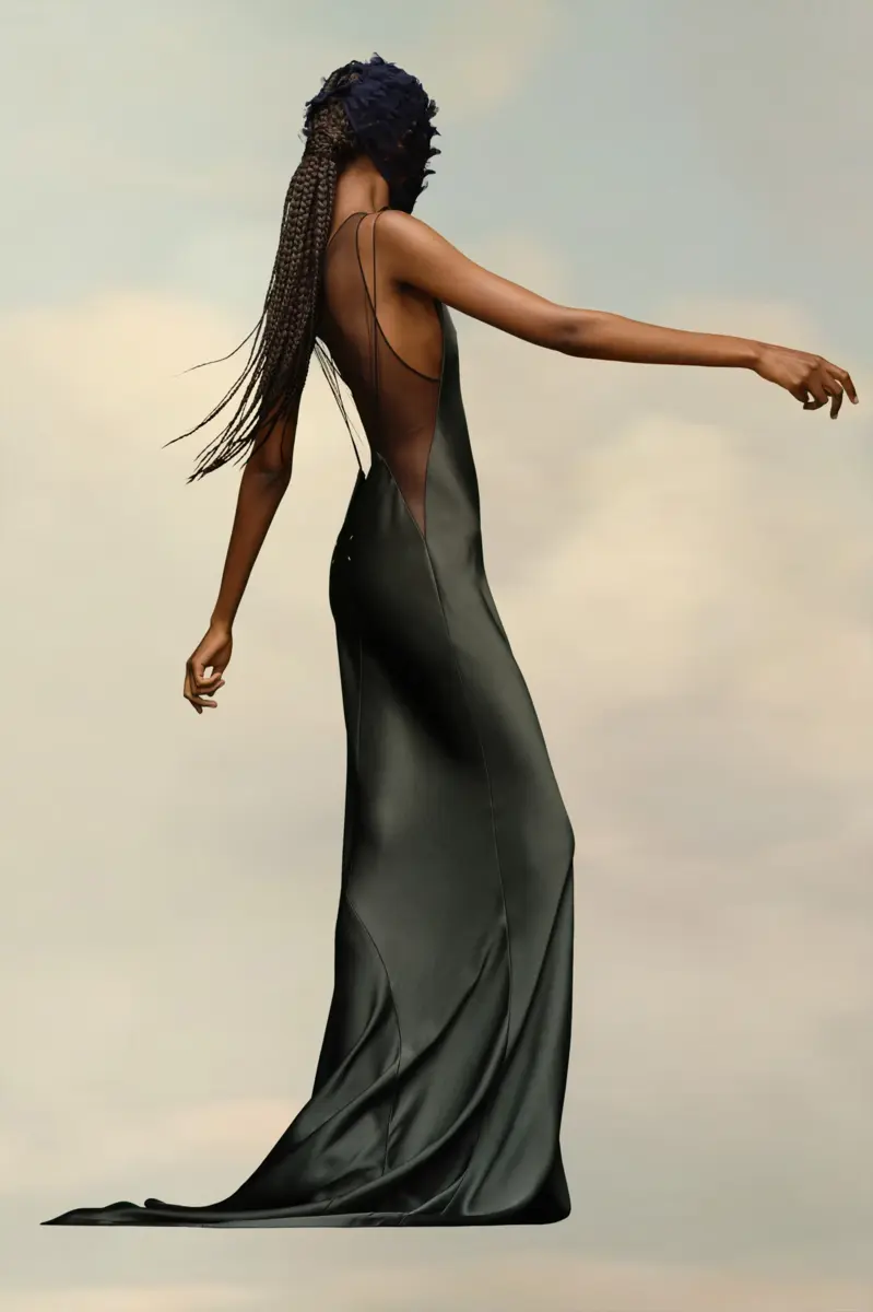 In hammered satin, this maxi dress which pools on the floor, follows a sleeveless design with a boat neck. Sheer panelling features at the chest and around the back, with a large cut-out. It’s finished with four white stitches showing the hand of the Maison: the opposite of a label.