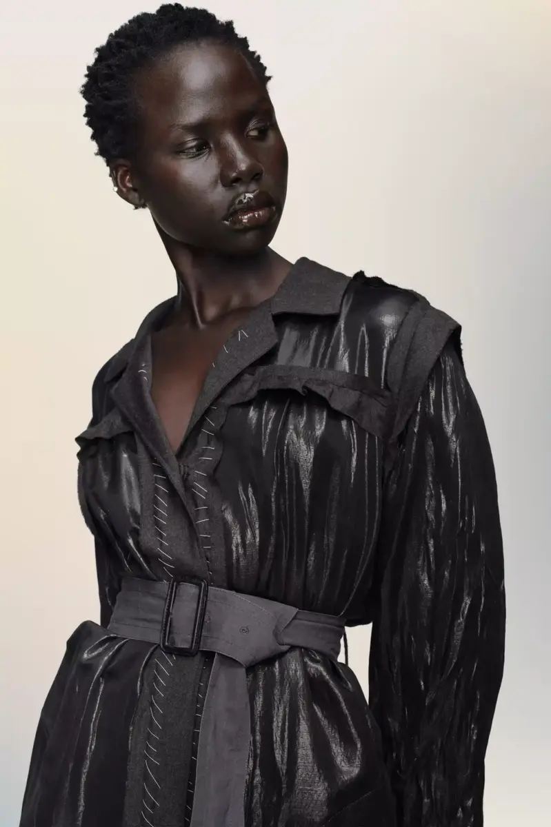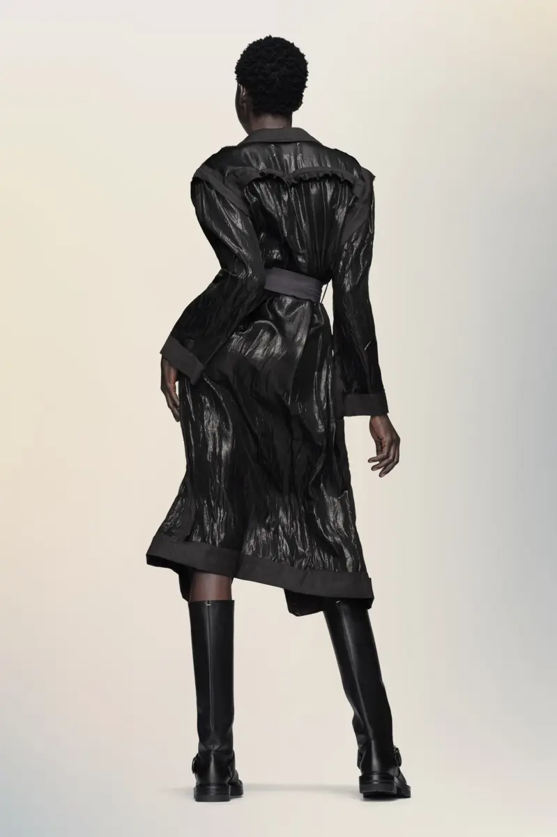 A reimagining of the trench coat in crinkled lamé, this piece offers a tactile interplay of matte and shine. Décortiqué shoulder details highlight hidden structures, while tonal trims and a structured belt frame the silhouette. The inside-out suggestion reveals a new form – a coat that becomes a dress. Maison Margiela’s signature, the four stitches, appear at the back; the opposite of a label.
