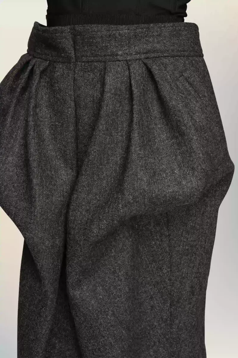 A strapless wool dress that balances architectural volume with a sense of ease. The upper body is held in place by a structured bustier, while the skirt exaggerates the natural silhouette through pleats that recall the Maison’s Gestural Cutting technique. At the back, the Maison’s signature four stitches appear; the opposite of a label.