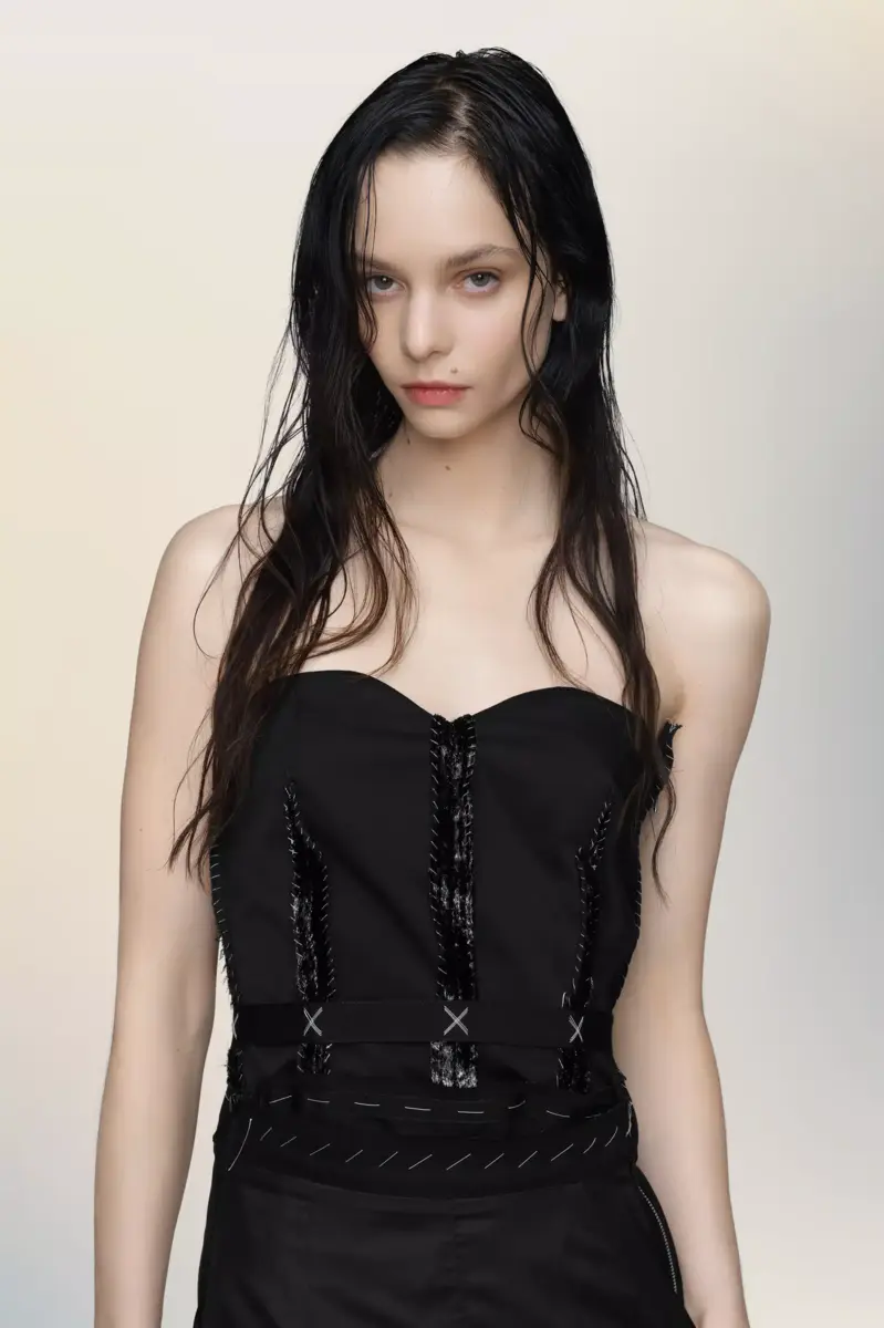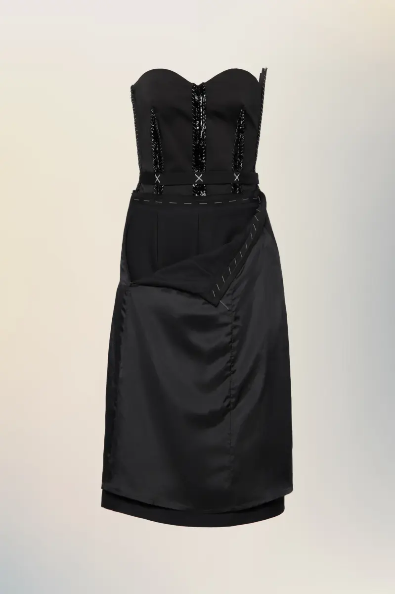 This strapless dress explores structure through contrast: a sculpted bodice, detailed with exposed boning and stitched embellishments, is anchored by a deconstructed skirt. The front zip allows for versatile styling, while the Maison’s Anonymity of the Lining subtly showcases the garment’s internal architecture. Maison Margiela’s signature, the four stitches, appear at the back; the opposite of a label.