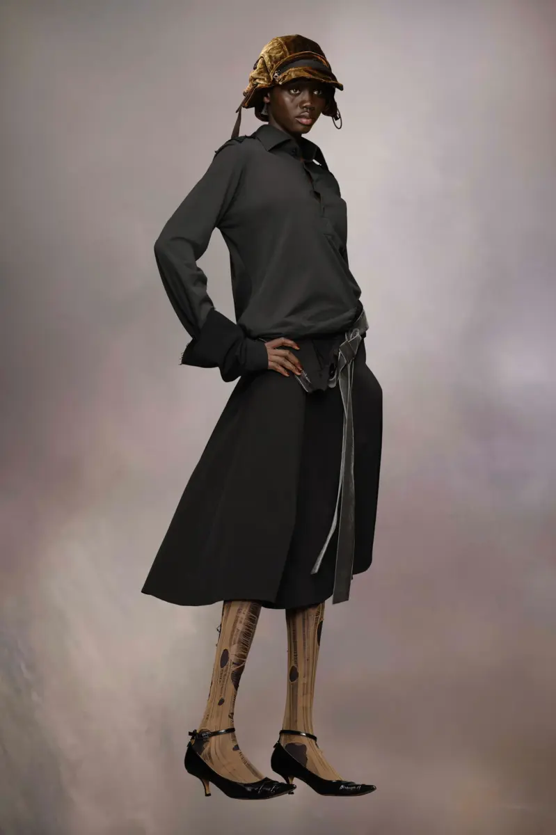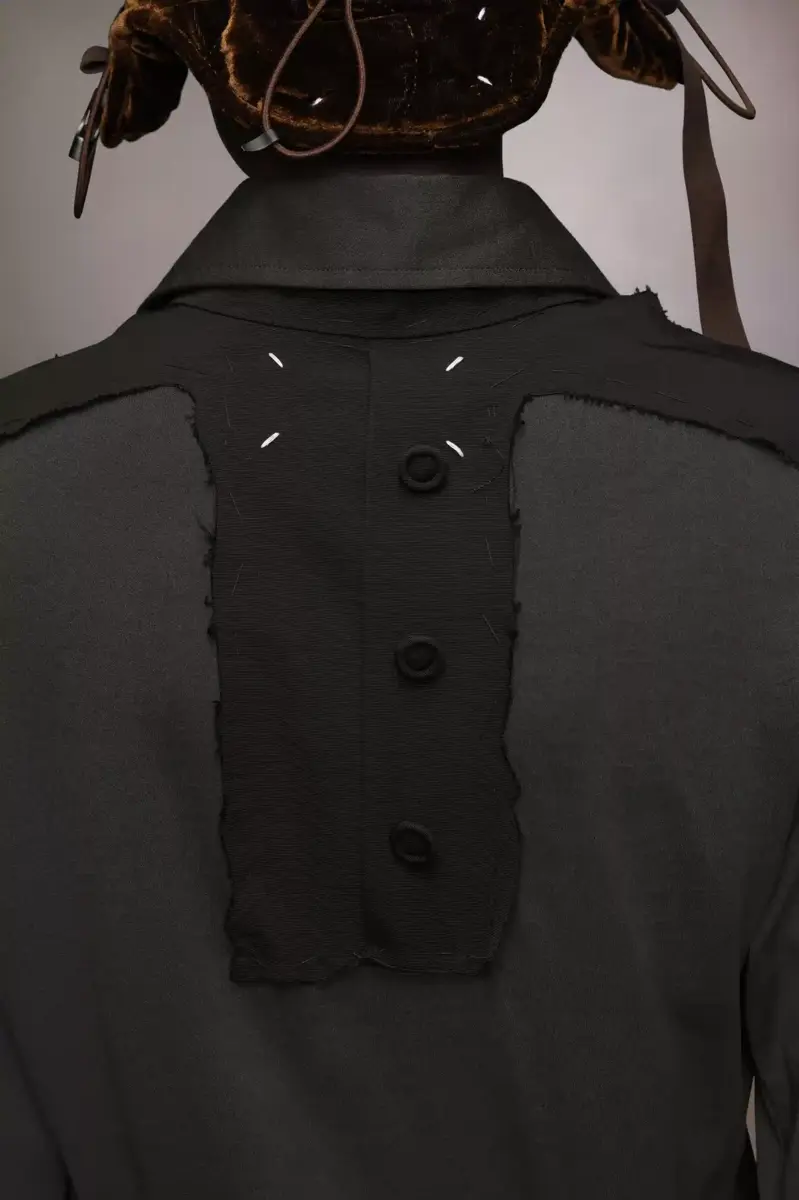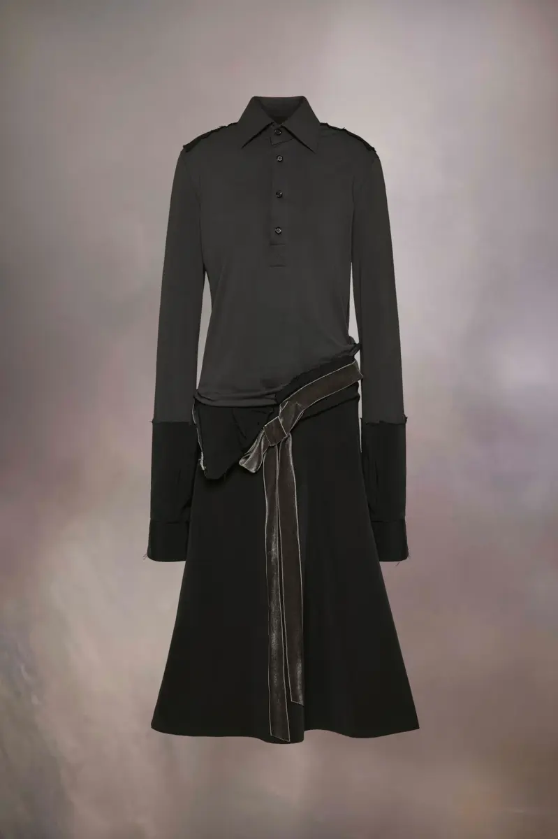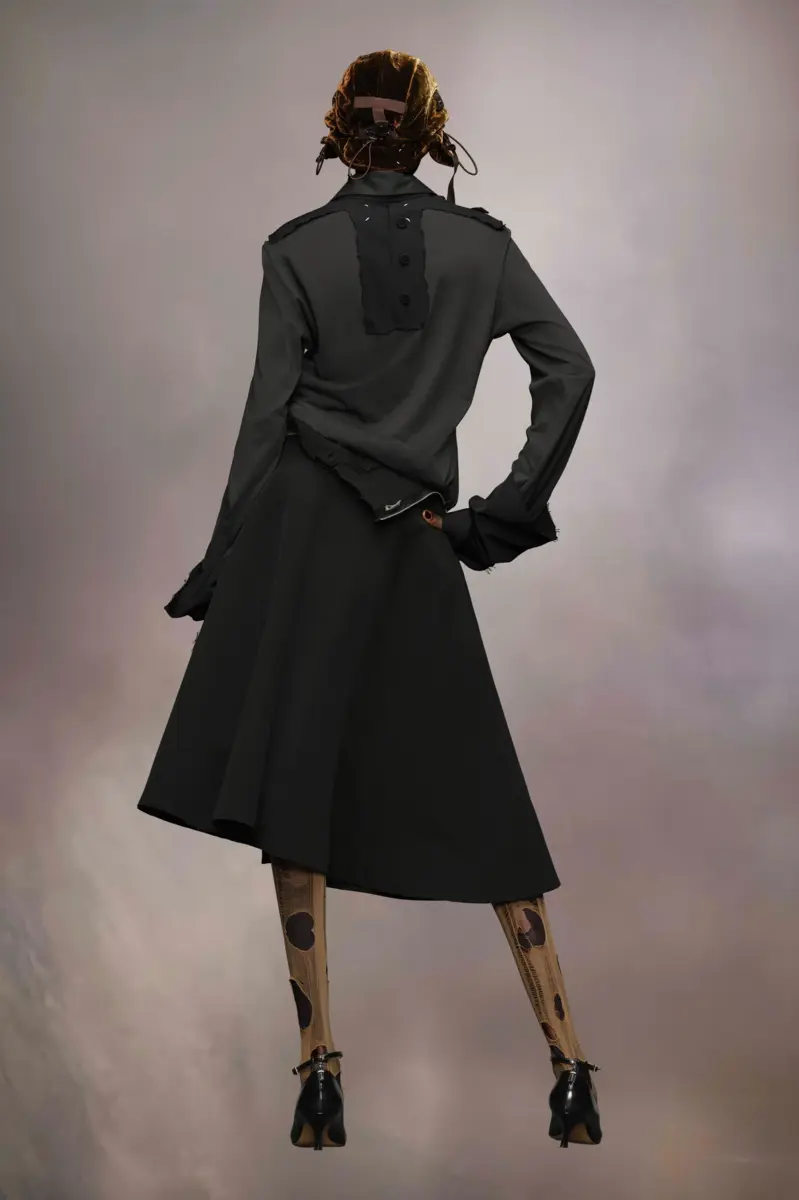 Embodying the Maison’s signature work-in-progress sentiment, the midi shirt-dress is crafted from cotton and viscose, creating a distinctive drop waist silhouette with distressed details for an unfinished look. It features a stand collar with button fastenings, long sleeves and a diagonally cut waistband formed by the skirt. Volume is introduced through contrast cuffs that play with proportions. Décortiqué details adorn the back while a long bow disrupts the front.