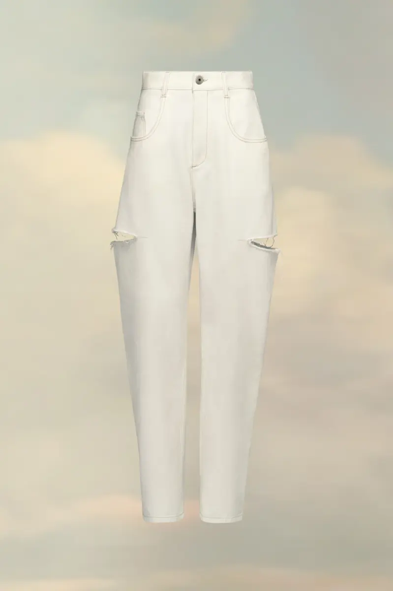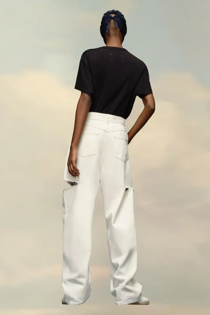 Loose-fitting denim jeans, tight at the waist and voluminous on the straight legs, which are left rough-cut to reveal fraying fabric at the slashes on the thighs. The jeans are crafted from cotton and have five pockets.