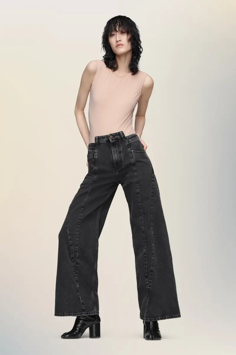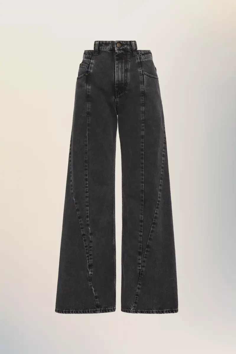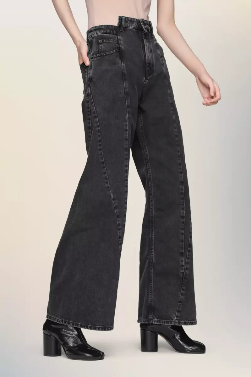 These spliced denim jeans challenge traditional denim with an unconventional, sculptural design. Geometric seams create dynamic tension and movement, while the high-waisted, wide-leg silhouette introduces a contemporary edge. The cut-out waist further elevates the deconstructed aesthetic, making these jeans a statement piece that fuses function with artistic expression.