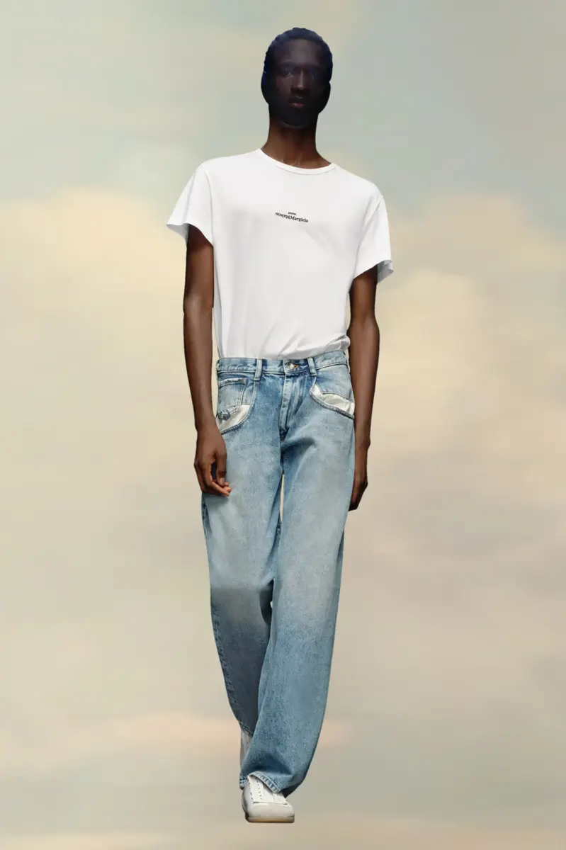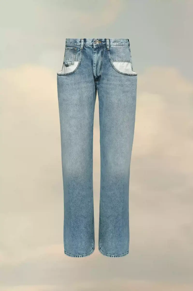 The classic denim jean has been reworked in the autumn-winter collection to reveal a contrast white insert on the front pockets, which are deliberately gaping for high impact. This stonewashed, cotton pair offers a relaxed fit with full-length, wide straight legs. Five pockets and belt loops are met with a contrasting camel-coloured topstitch, which also runs down the seams.
