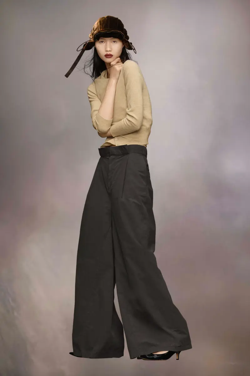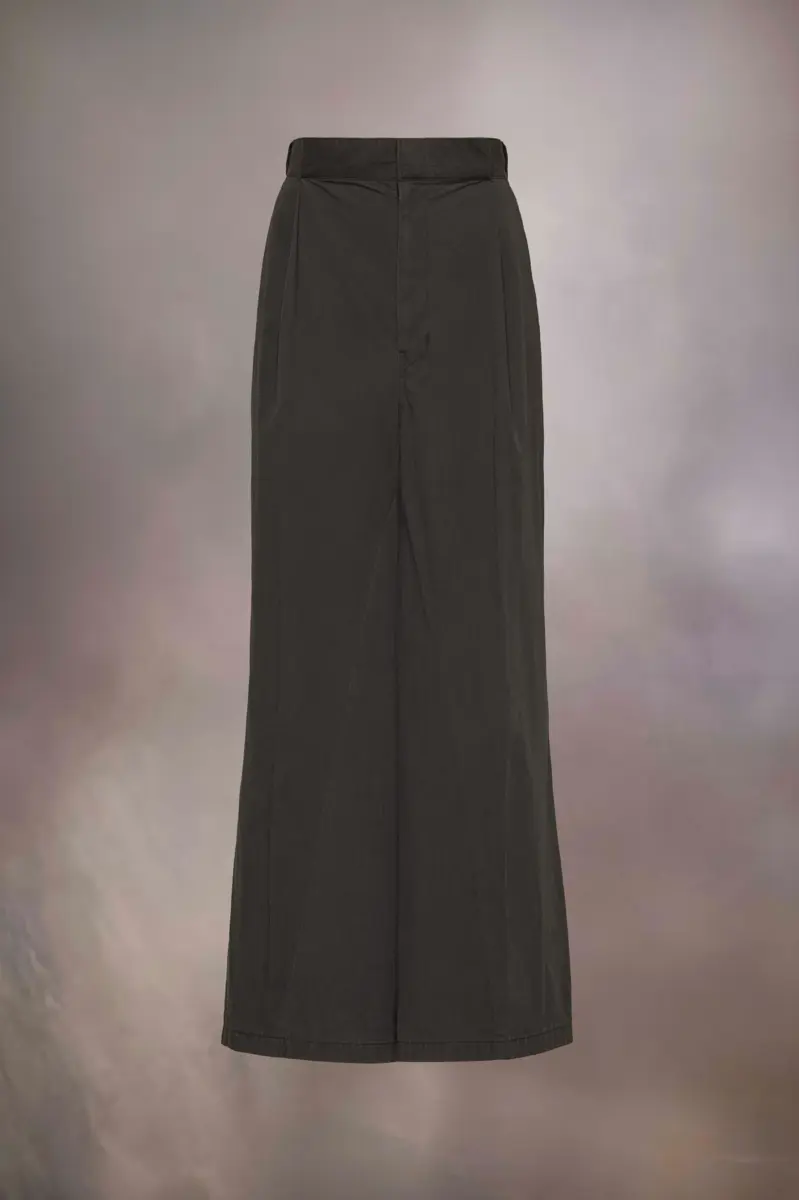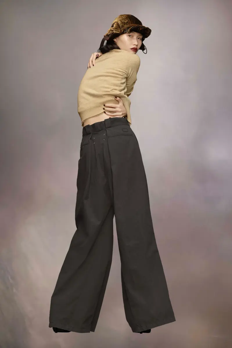 The wide-leg trousers come in a cotton blend with exaggerated folded pleat details creating an impactful silhouette and revealing the inner fabric at the waistband. The trousers are complete with wide belt loops, pockets and hidden fastening placket for a clean aspect. Maison Margiela’s signature, the four stitches, appear at the back; the opposite of a label.
