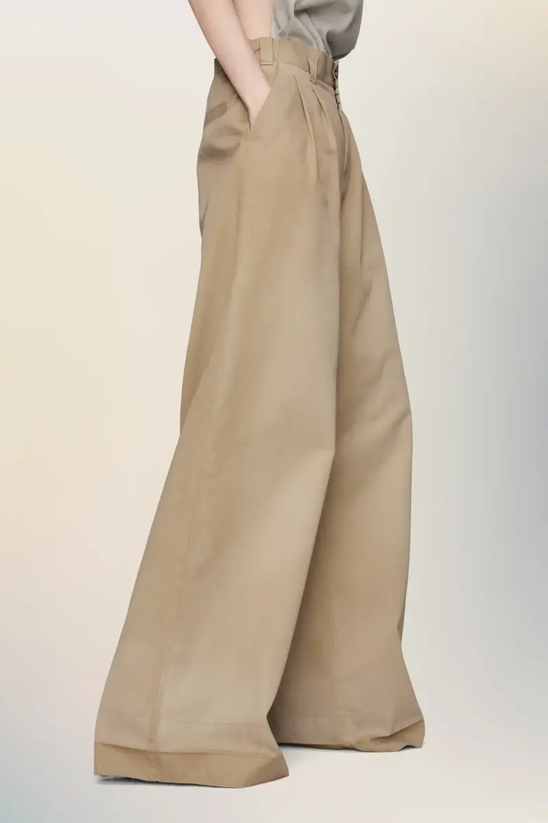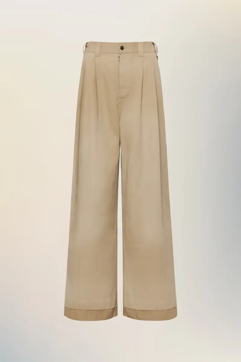 The wide-leg skater chino trousers feature a high-waist with pleats, and the Margiela hook. The back is elasticated, and features welt pockets. At the hem, the Memory of technique shows softly visible fold-lines, adding timeworn character to a modern form. Maison Margiela’s signature, the four stitches, appear at the back; the opposite of a label.