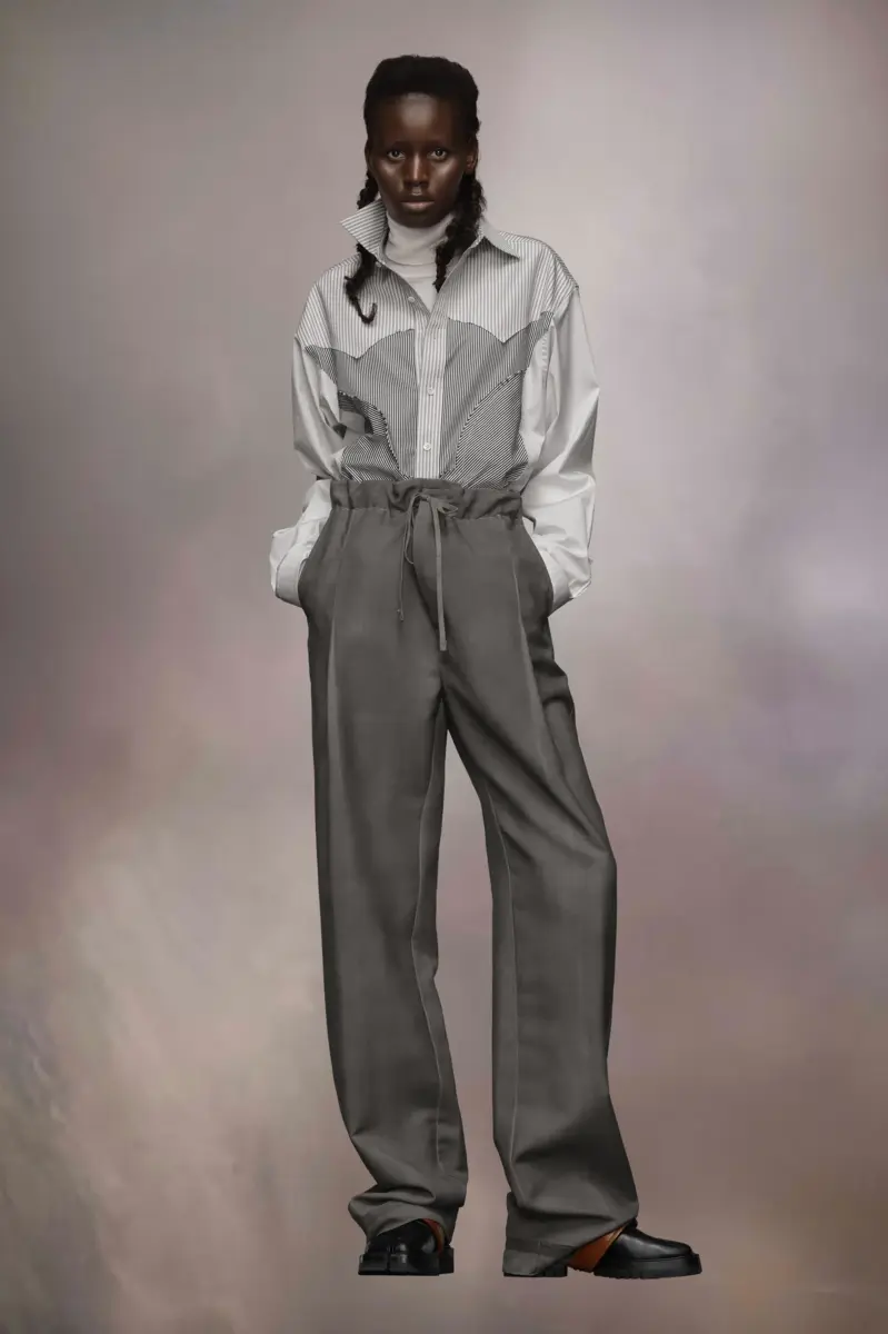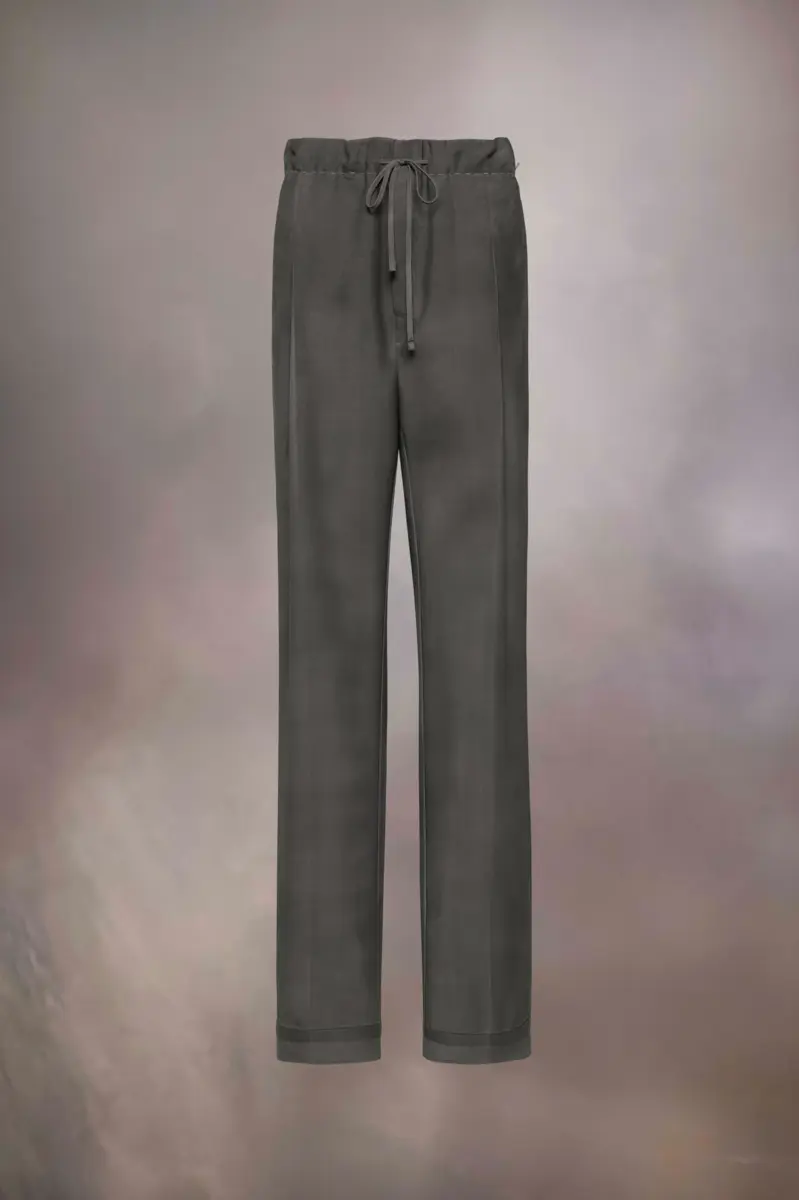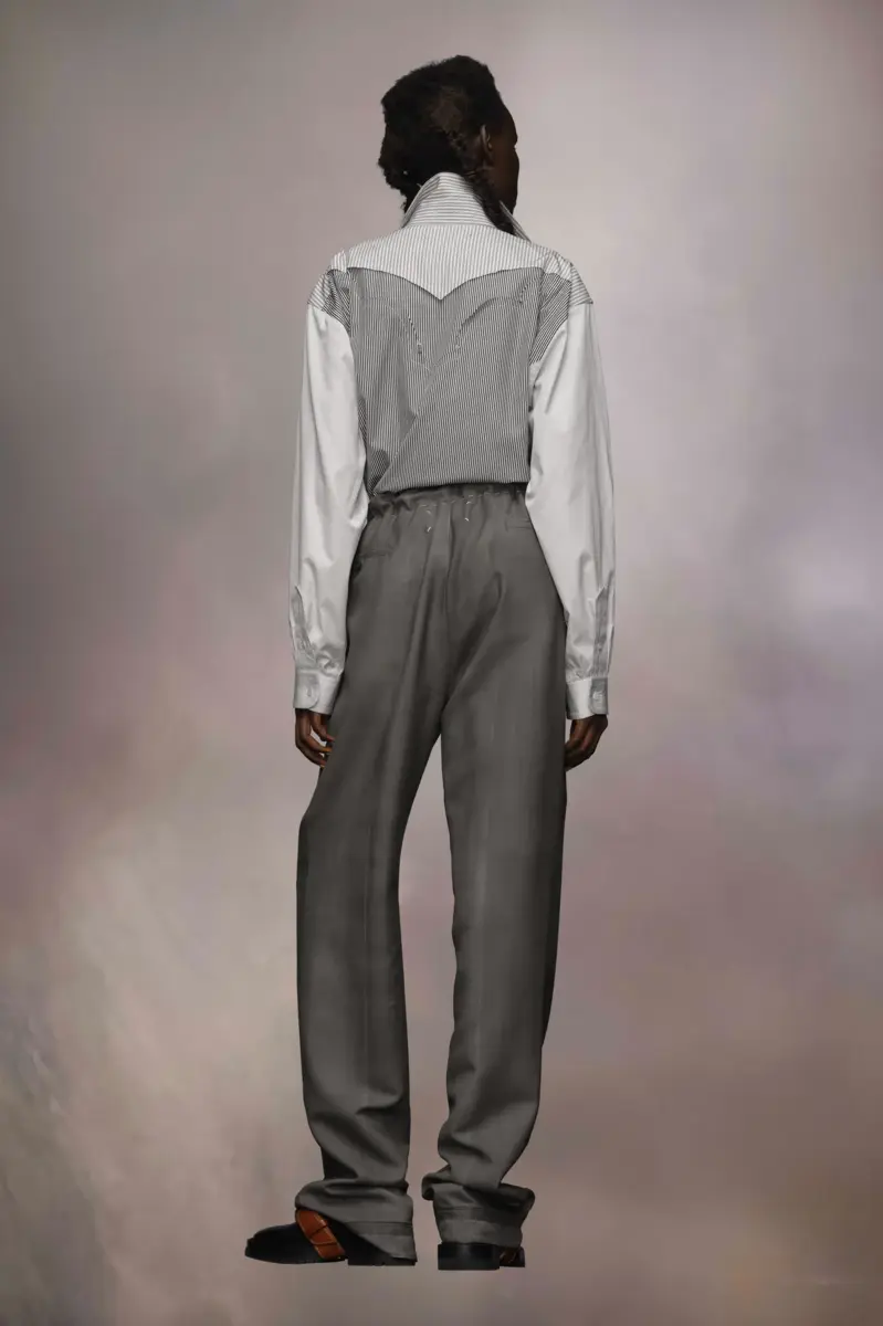 Made in wool mohair, the trousers showcase the Maison’s Work-in-progress stitches around the waist. The casual drawstring is contrasted with smart pleats. They feature a hand-applied greasy patina technique for a lived-in look. Maison Margiela’s signature, the Four stitches, appear at the back; the opposite of a label.