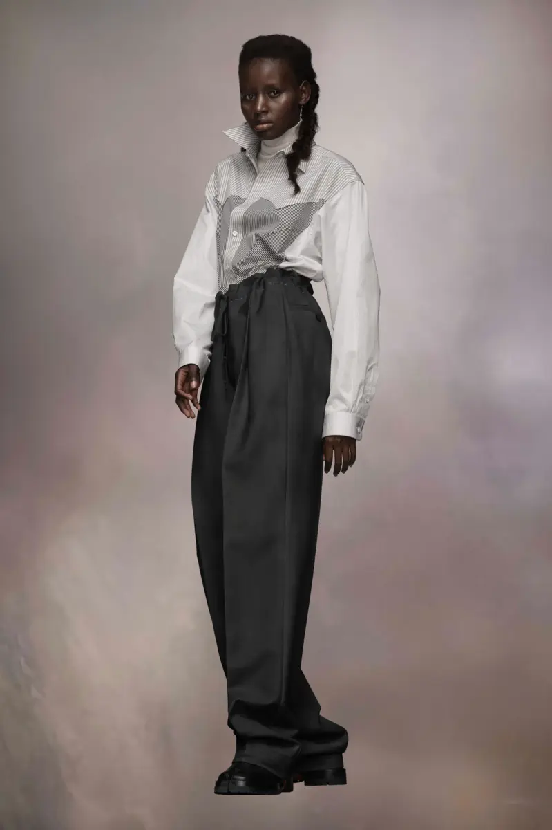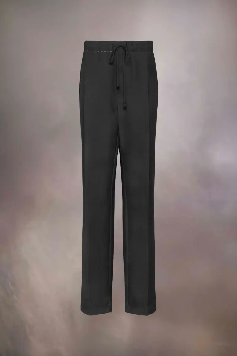 Made in wool mohair, the trousers showcase the Maison’s Work-in-progress stitches around the waist. The casual drawstring is contrasted with smart pleats. They feature a hand-applied greasy patina technique for a lived-in look. Maison Margiela’s signature, the Four stitches, appear at the back; the opposite of a label.