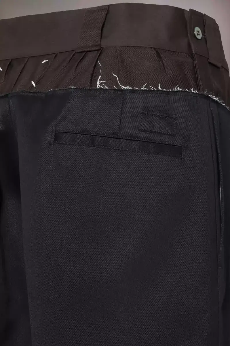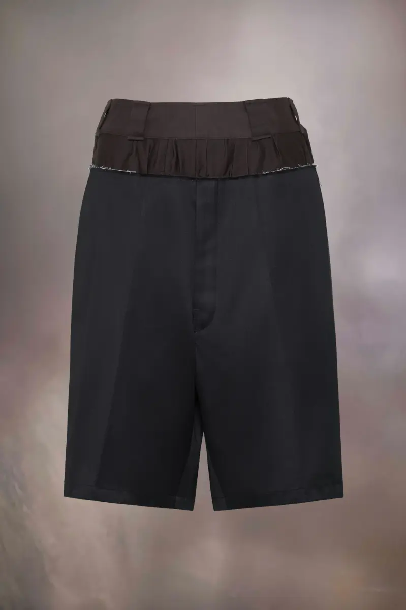 The knee-length shorts suggest a new take on the gentleman’s wardrobe, with a raw-cut waist that reveals contrast fabric ruched in between the waistband, exploring the Anonymity of the lining concept. They are complete with belt loops and back pockets. Maison Margiela’s signature, the four stitches, appear at the back; the opposite of a label.