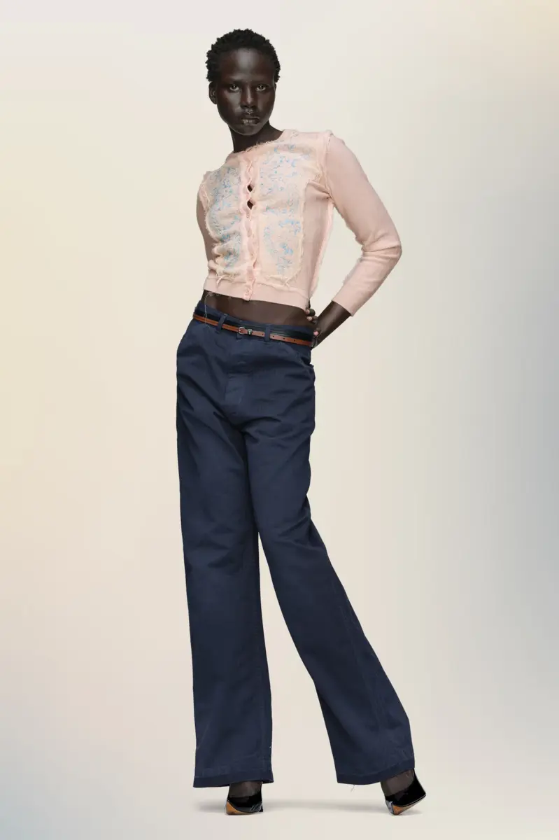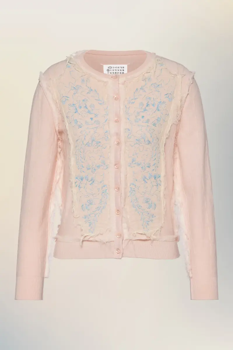 This cardigan is framed by contrast, with appliqué patches that resemble the reverse side of delicately embroidered fabric. Vertical stitch lines mirror the inside of a garment, aligning with the Maison’s décortiqué approach. Maison Margiela’s signature, the four stitches, appear at the back; the opposite of a label.