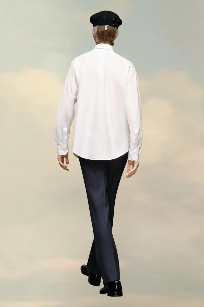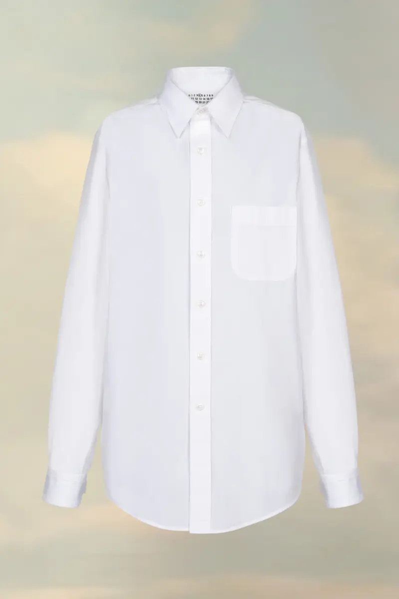 The classic long-sleeved shirt in eco cotton poplin with a collar, buttoned placket and chest pocket. Maison Margiela’s signature, the four stitches, appear at the back; the opposite of a label.
