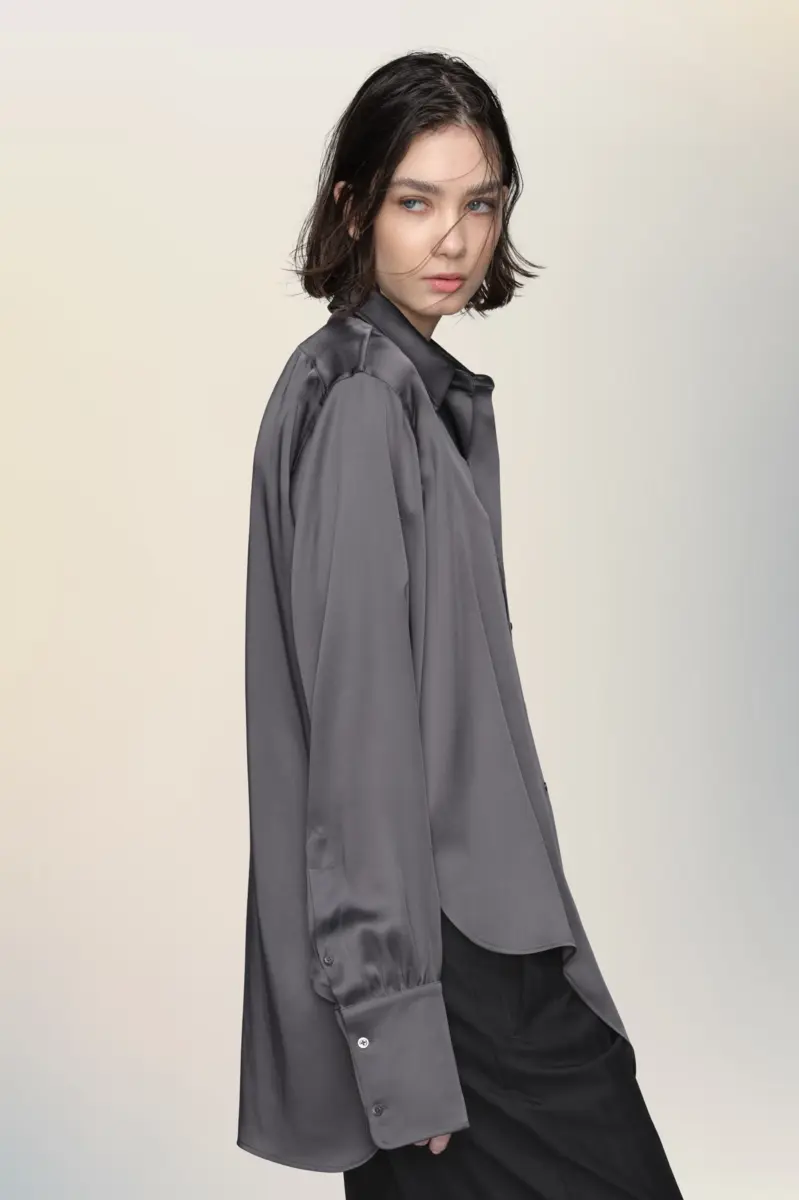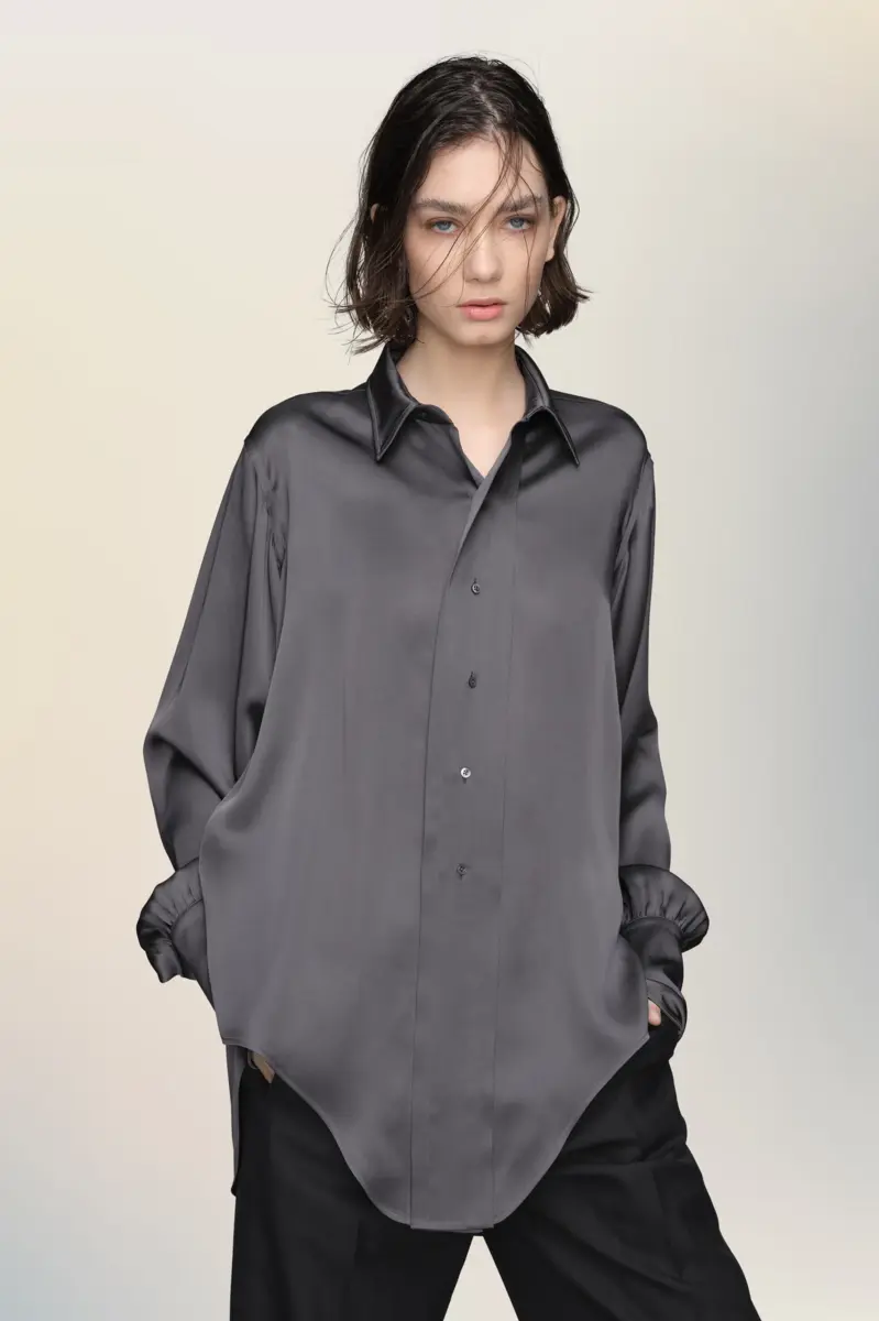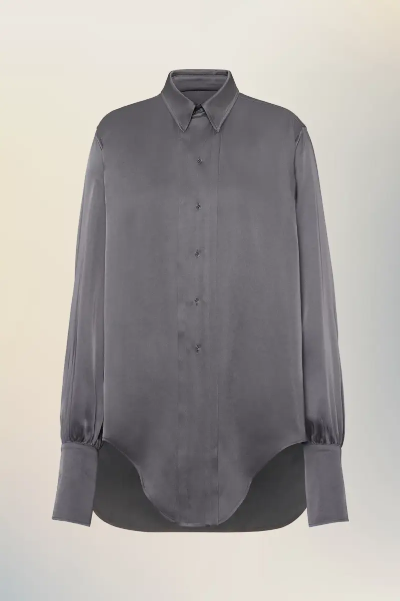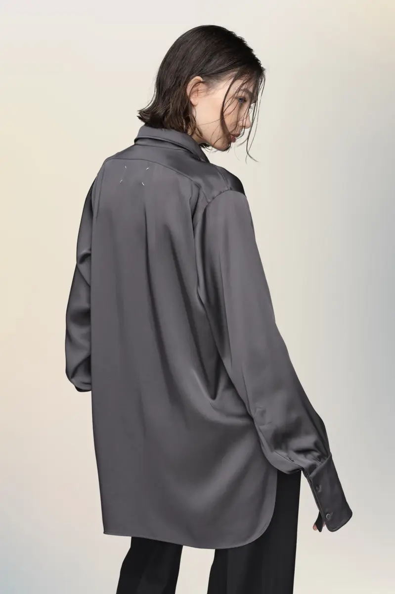 Defined by its sculpted hemline and exaggerated cuffs, this lustrous satin shirt tempers fluid drape with architectural clarity. The subtle sheen enhances its refined silhouette, echoing Maison Margiela’s minimal yet expressive aesthetic. Maison Margiela’s signature, the four stitches, appear at the back; the opposite of a label.