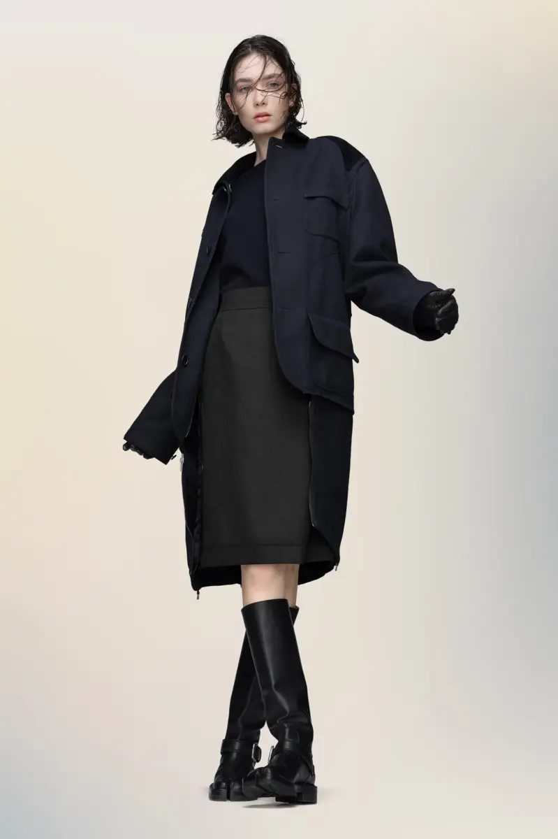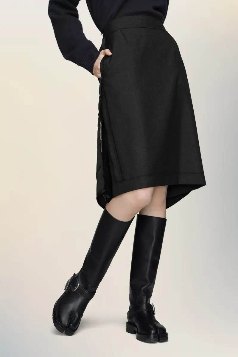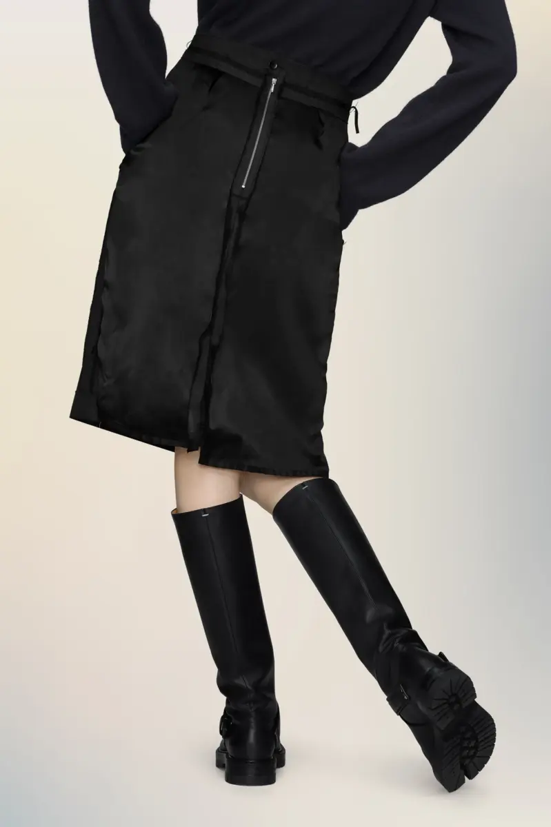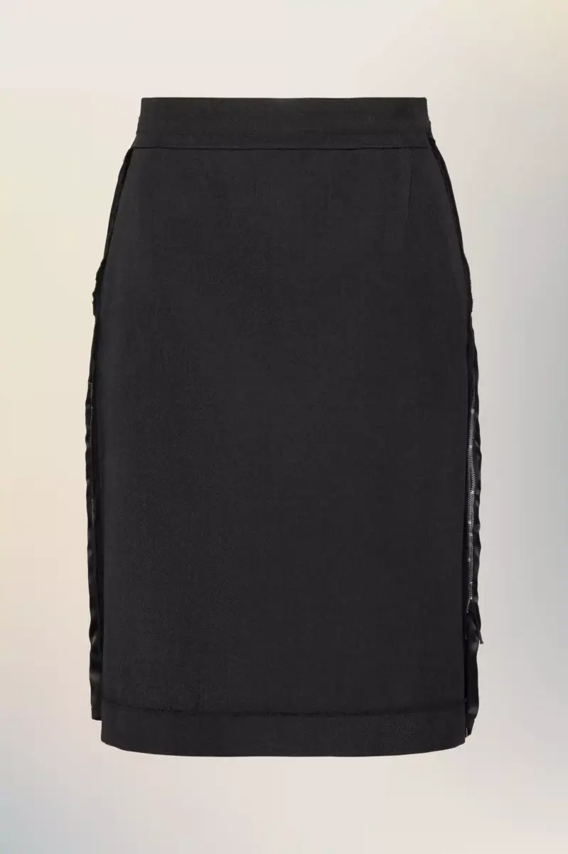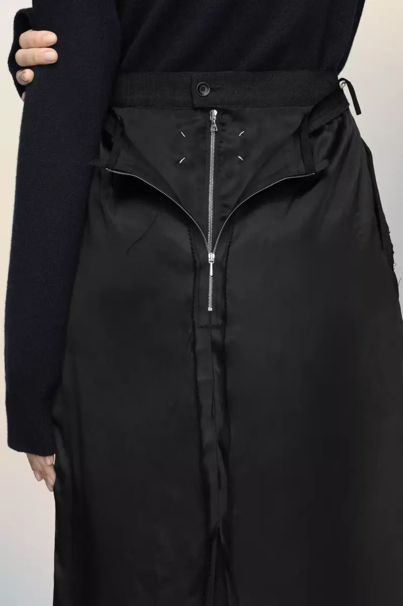 Defined by clean lines and minimalist construction, this pencil skirt has a structured silhouette with tonal side trims for subtle contrast. An open zip at the back adds versatility to the fit and styling. Maison Margiela’s signature, the four stitches, appear at the back; the opposite of a label.