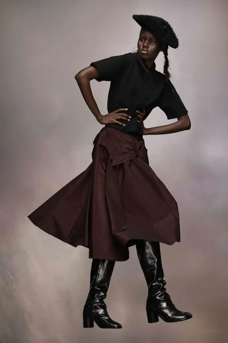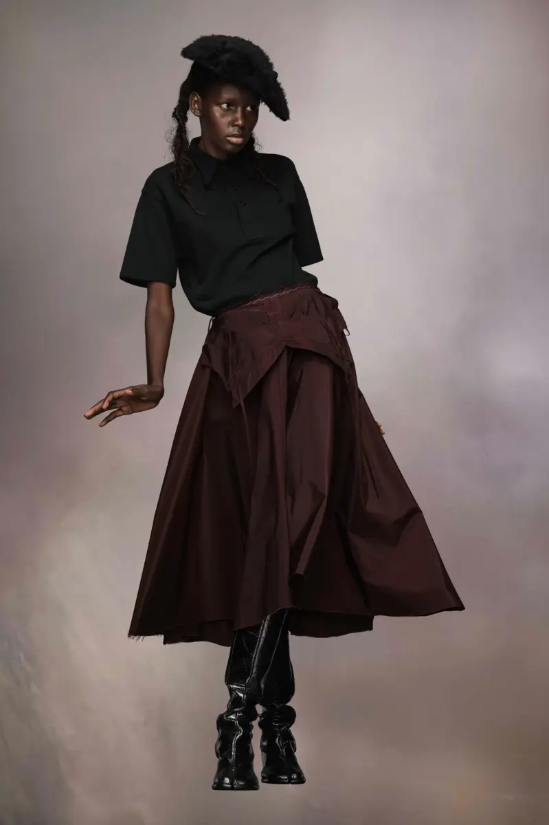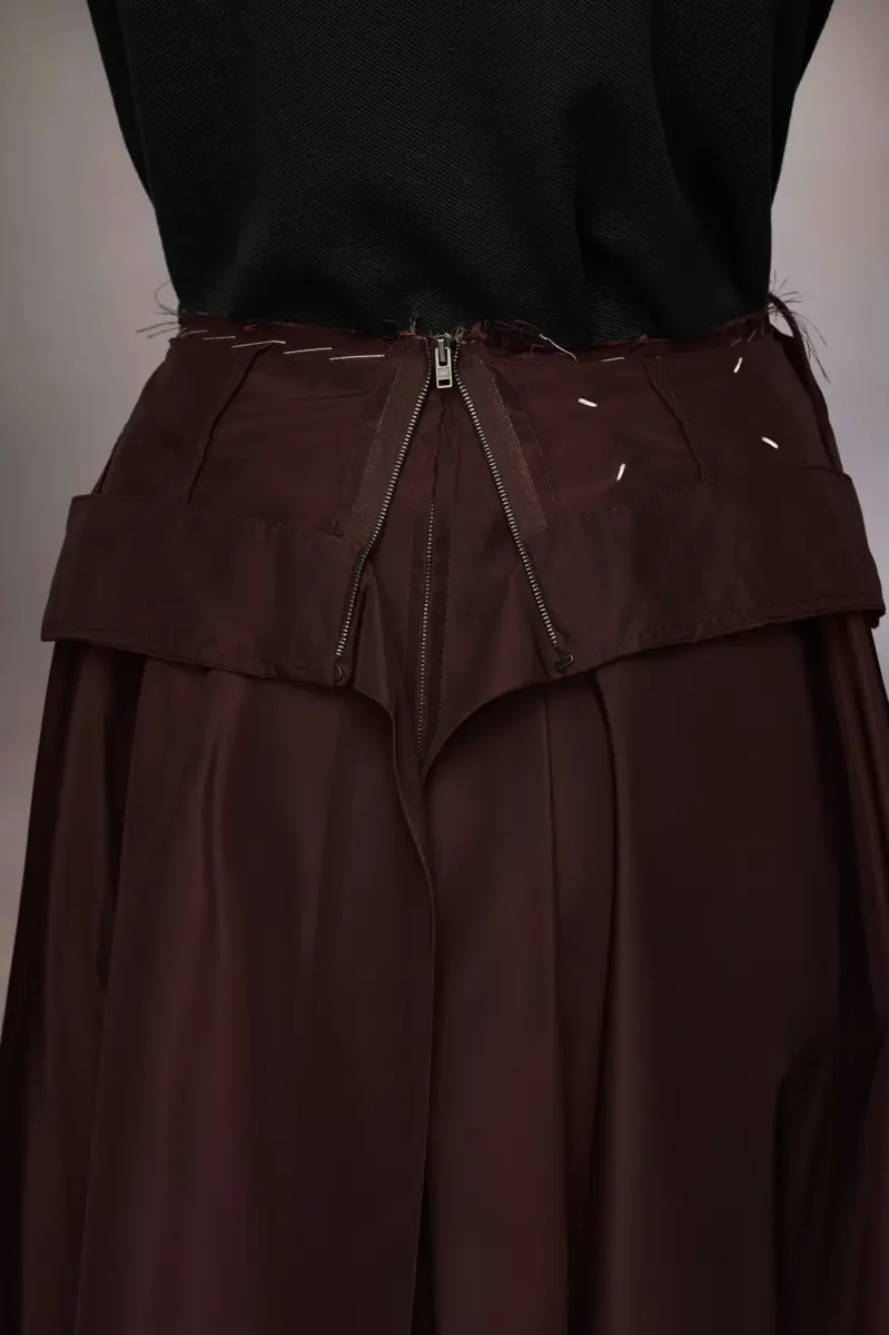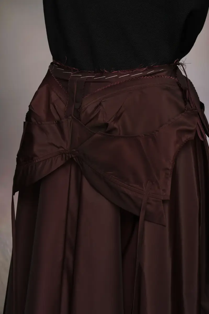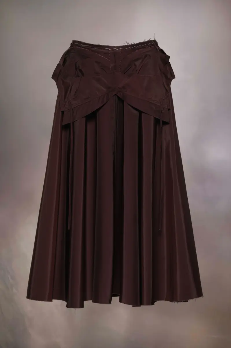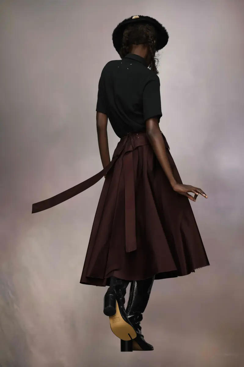 Created in poly taffeta, the voluminous midi skirt features a folded down front, reworking the silhouette; complete with the Maison’s Work-in-progress stitches. The back sports a bow and open zip to further the unfinished aesthetic. Maison Margiela’s signature, the Four stitches, appear at the back; the opposite of a label.