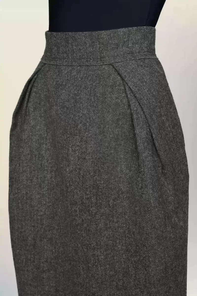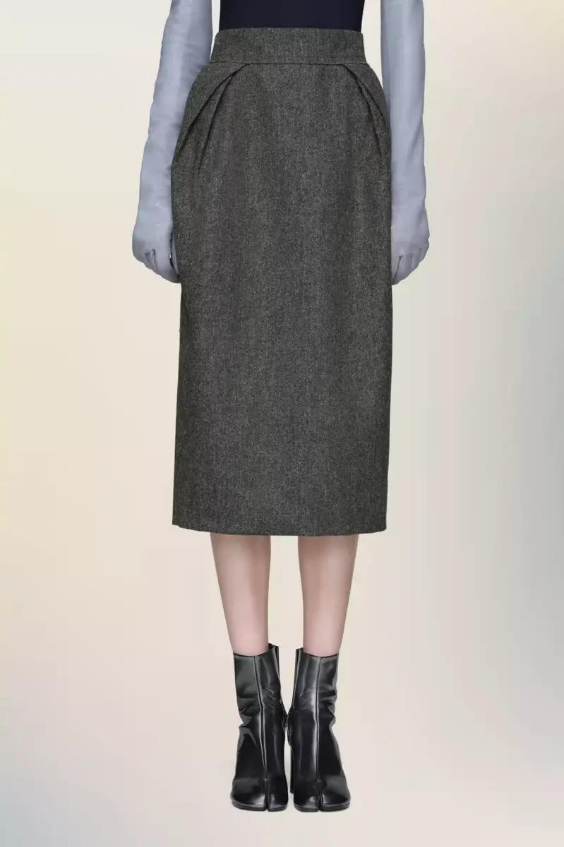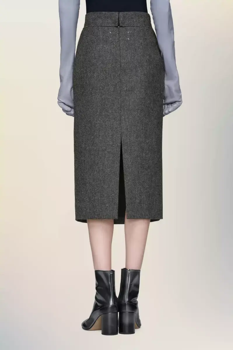 Tailored from thick wool with a soft herringbone texture, this midi skirt features structured front pleats that create volume through the hip. A high waistband frames the silhouette, drawing focus to the subtle architectural shaping. At the back, the Maison’s signature four stitches appear; the opposite of a label.