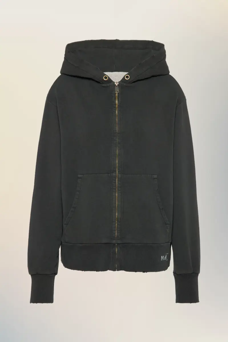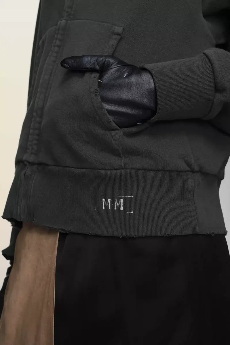 This hooded sweatshirt offers a softer take on a casual staple. Crafted in cotton, its ribbed trims and raw hems suggest wear through time. The discreet ‘MM’ embroidery finishes the piece with the Maison Margiela signature. The four stitches appear at the back; the opposite of a label.