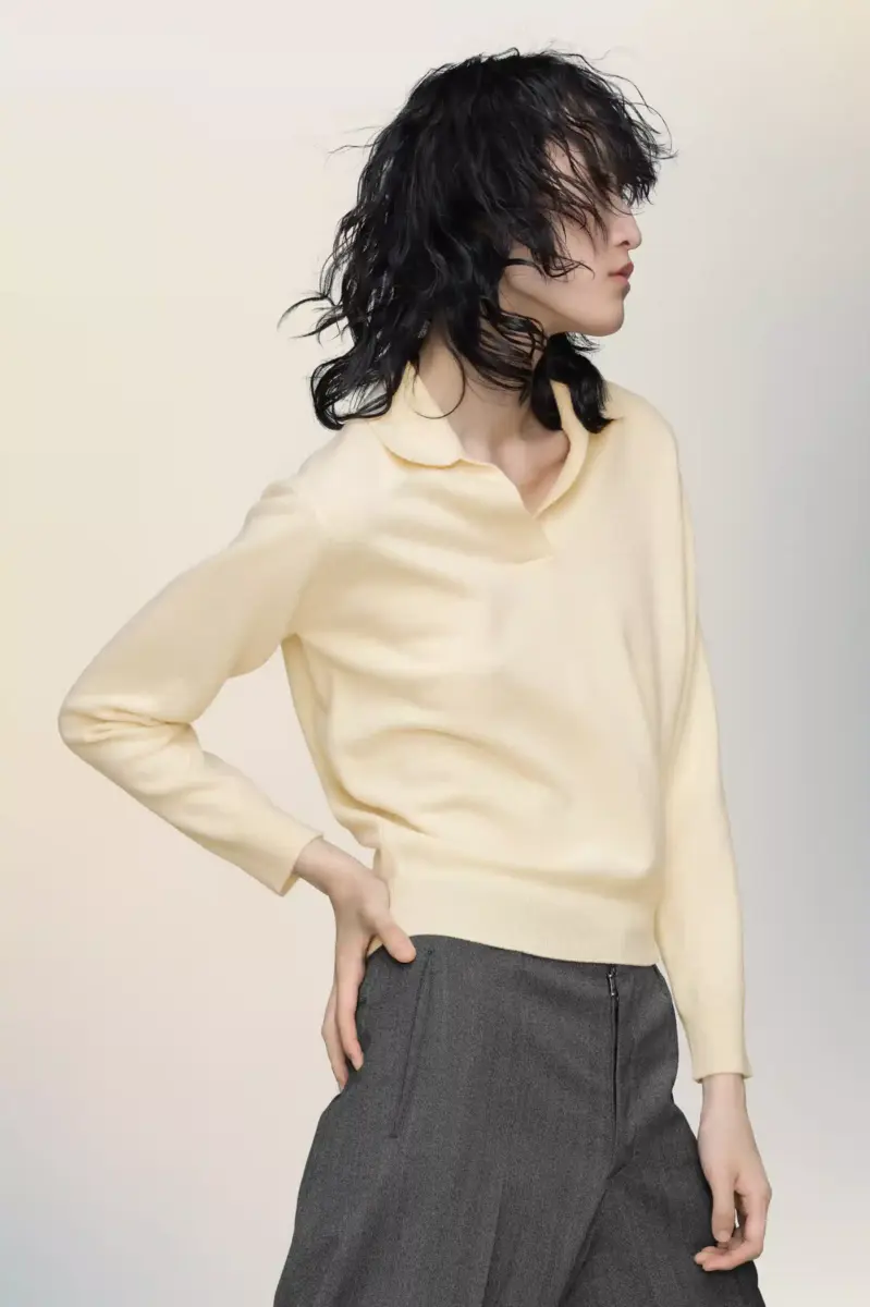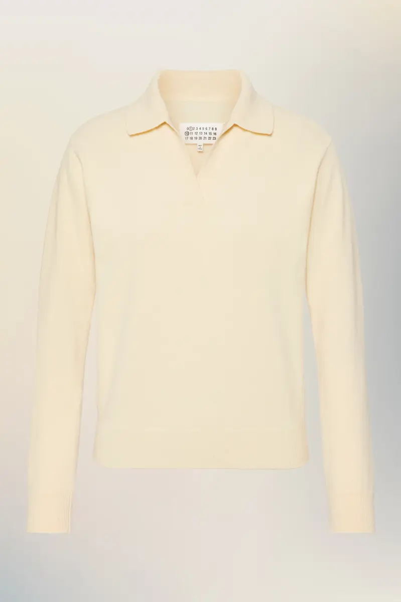 With its open collar and ribbed trims, this wool knit references heritage polo shapes. The silhouette features a relaxed fit, and a soft luxurious feel. Maison Margiela’s signature, the four stitches, appear at the back; the opposite of a label.