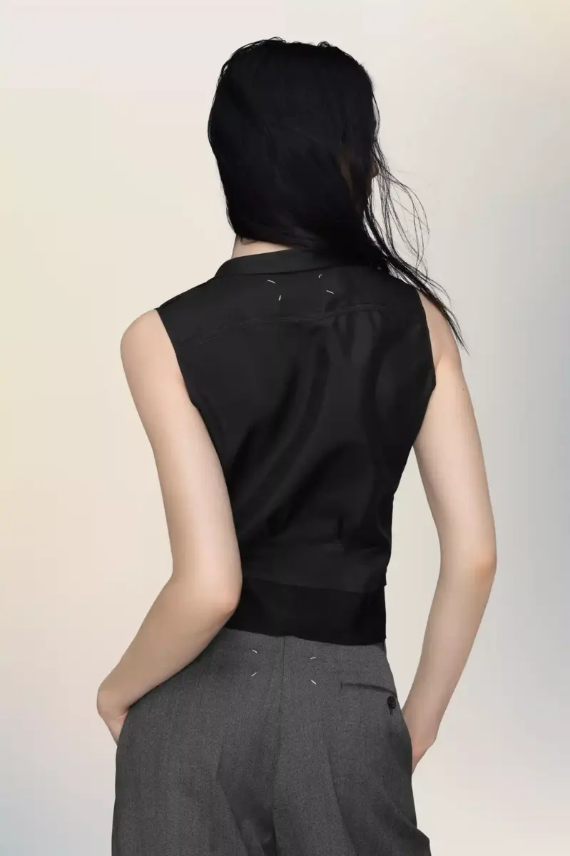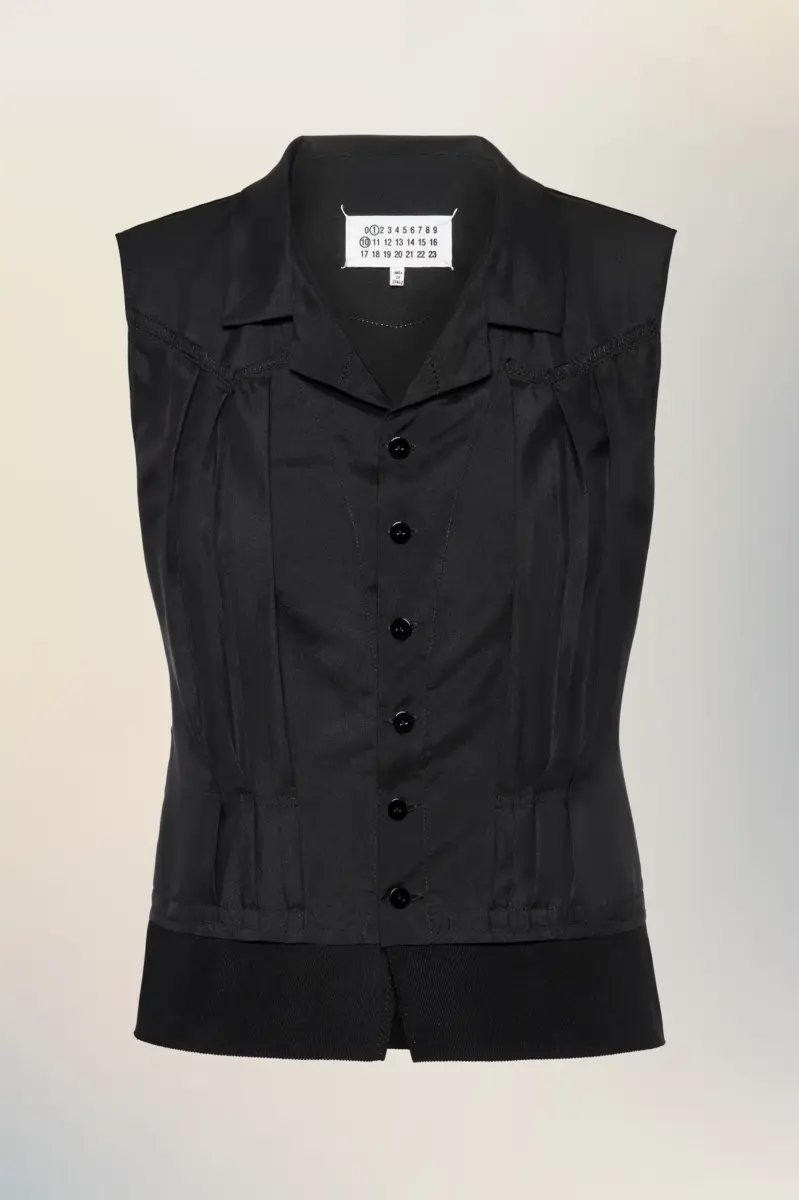 Silk tailoring is deconstructed in this sleeveless blouse, defined by sculptural pleats, exposed inner seams, and a contrast hem that gestures to shirting. A flat collar and button-up front introduce classic details, while the silhouette balances softness with structure for a modern take on traditional form. Maison Margiela’s signature, the four stitches, appear at the back; the opposite of a label.