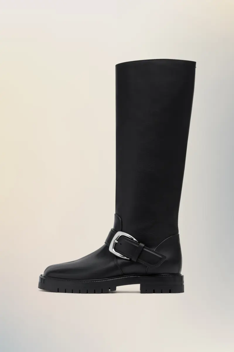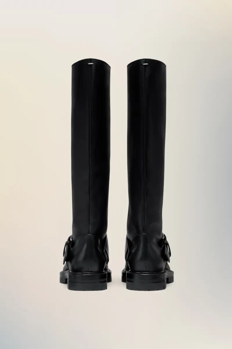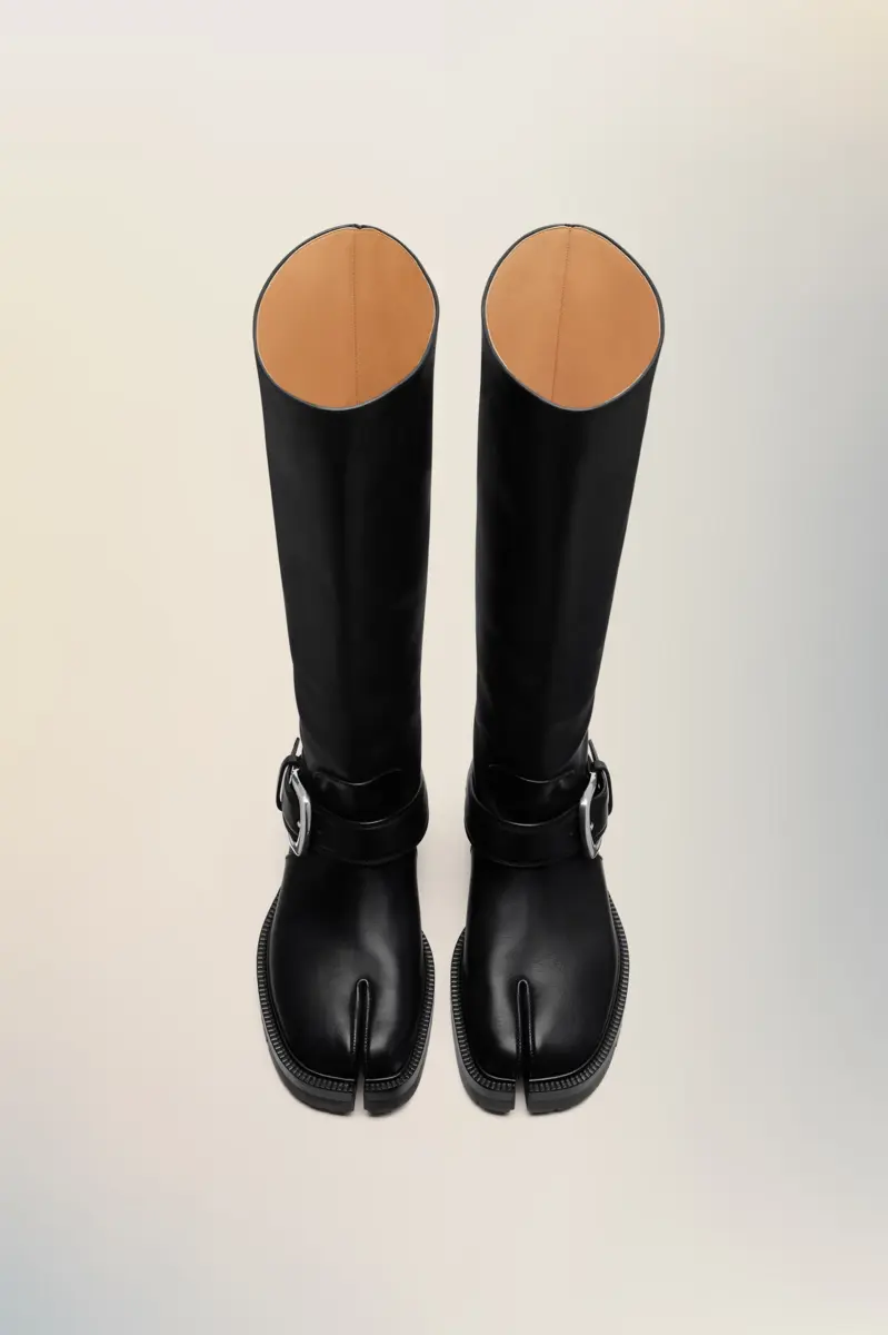 These knee-high Tabi boots are rendered in fine box calf leather with a tubular upper and heavy-duty ankle strap. They feature the Tabi split-toe, inspired by the traditional 15th century Japanese sock bearing the same name – launched for the Maison’s debut collection in 1989. It captures the avant-garde and insubordinate spirit of the Maison and exists as a heritage classic, continually explored through each collection. Maison Margiela’s signature single white stitch appears at the back.