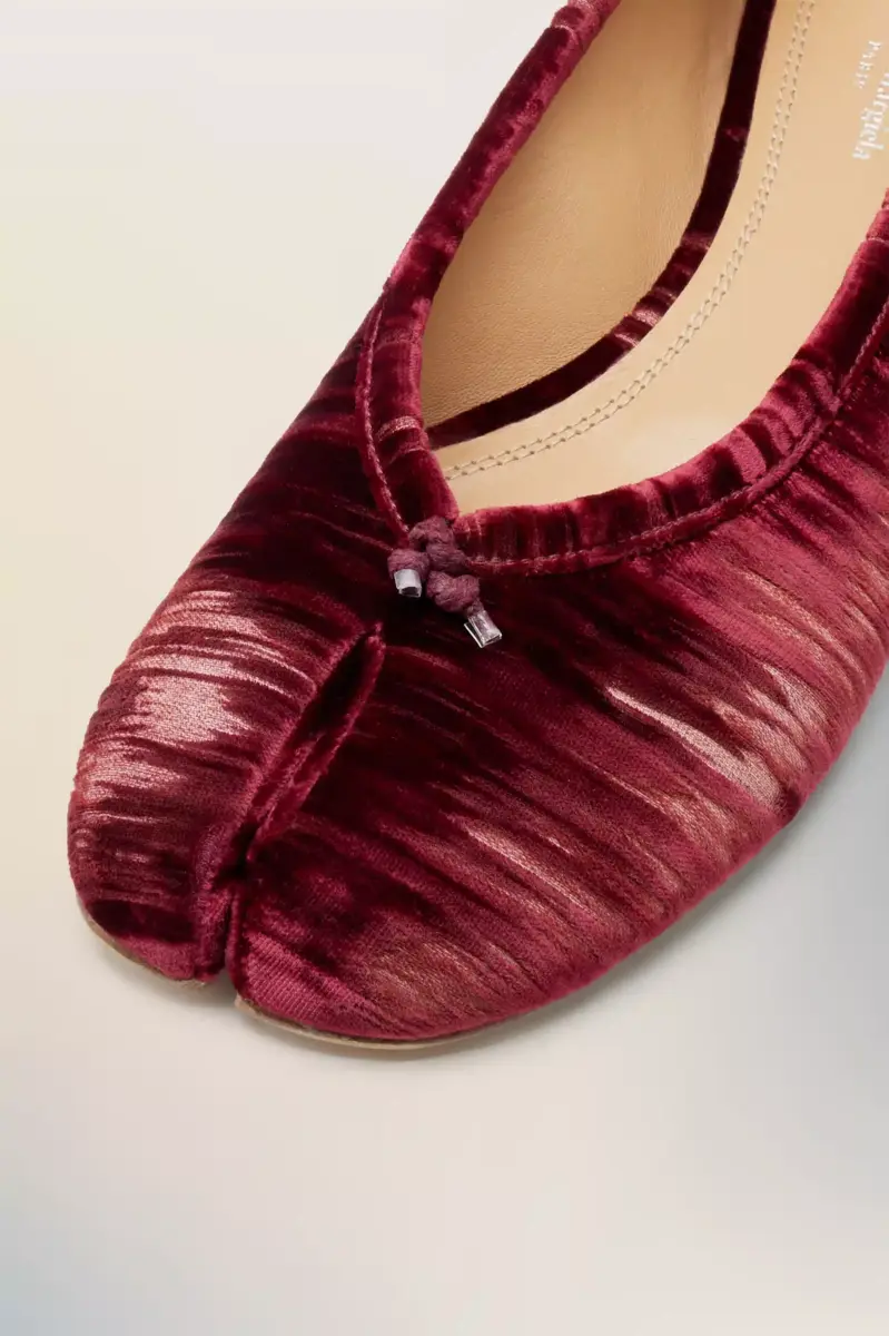 The Tabi ballerina is crafted in pleated velvet, laser-treated and hand distressed evoke the passage of time. The result is a textured patina – one that speaks of memory, motion, and craft. A supple ovine lining and sleek leather sole provide tactile contrast to the sculptural upper. They feature the Tabi split-toe, inspired by the traditional 15th century Japanese sock bearing the same name – launched for the Maison’s debut collection in 1989. It captures the avant-garde and insubordinate spirit of the Maison and exists as a heritage classic, continually explored through each collection. Maison Margiela’s signature single white stitch appears at the back.
