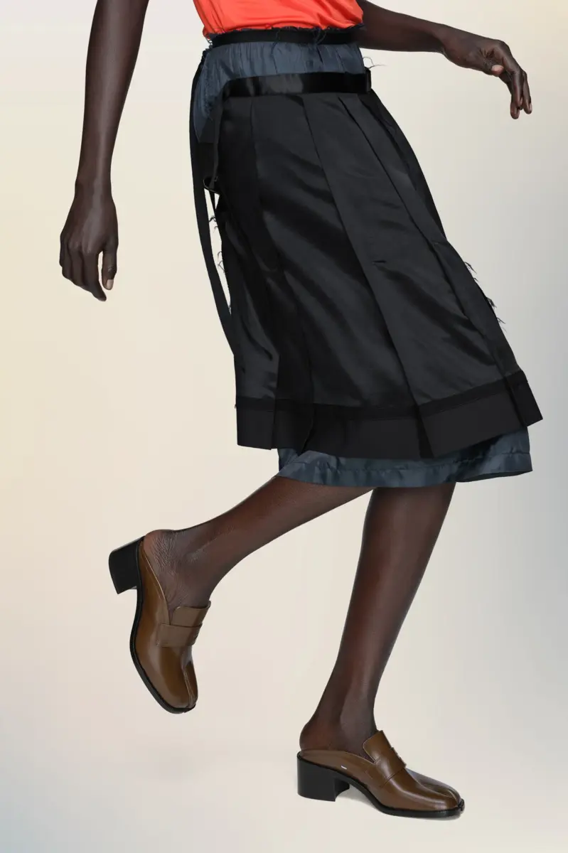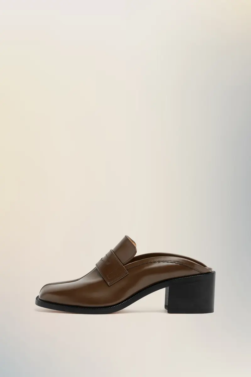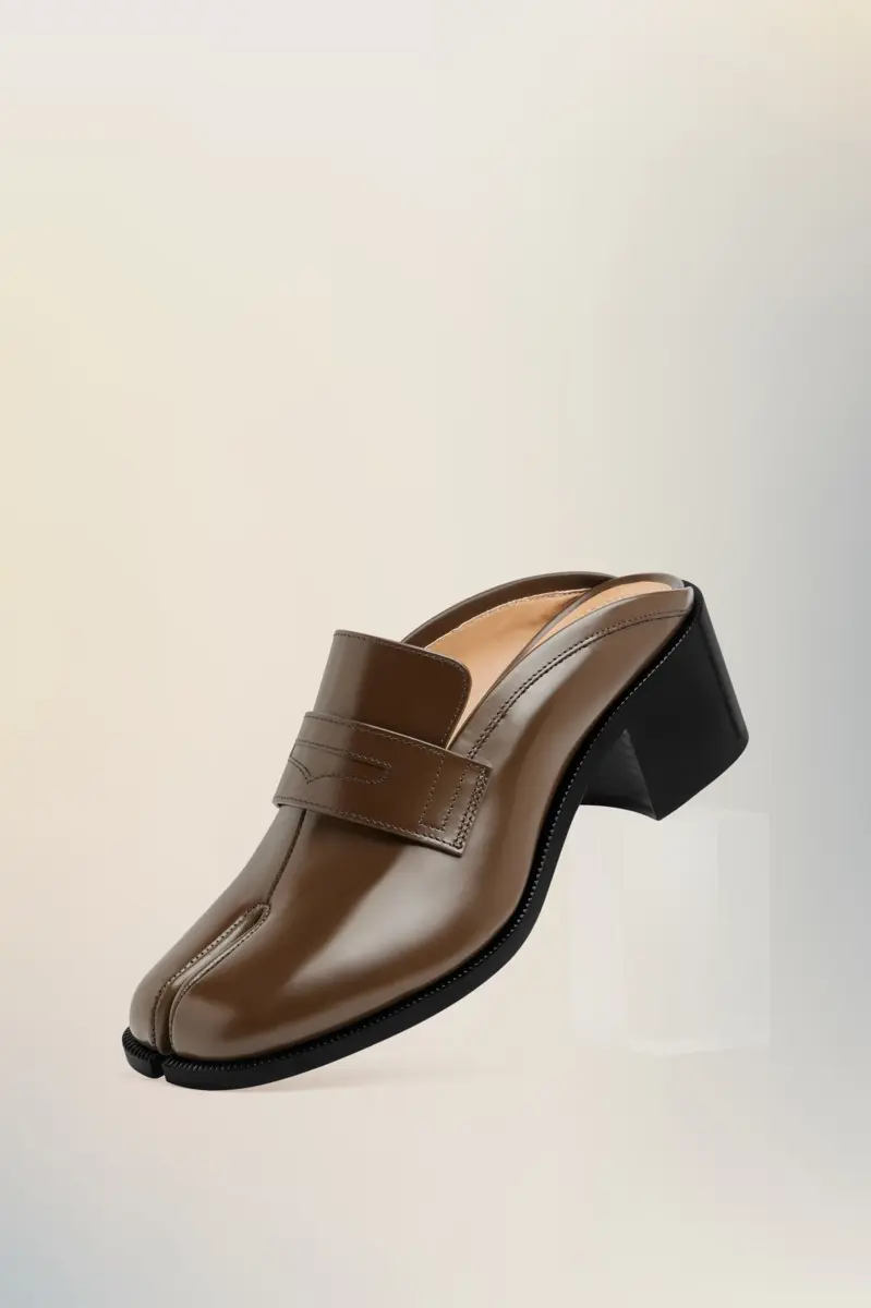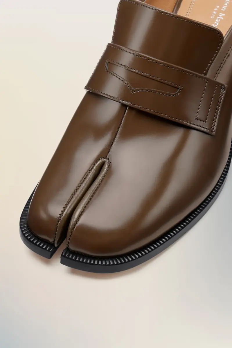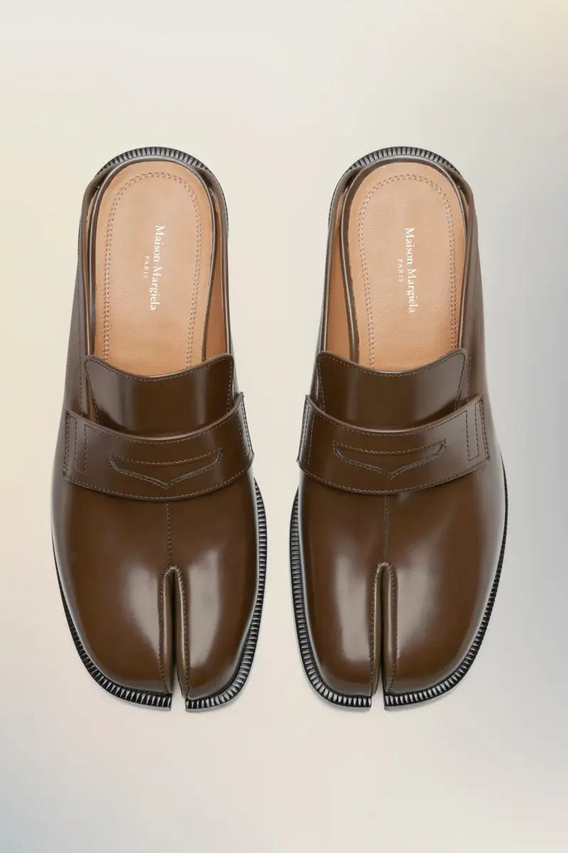 Crafted in polished calfskin for a sleek finish, these mules reinterpret the classic penny loafer – a staple of British city dressing – as a refined slip-on silhouette. They feature the Tabi split-toe, inspired by the traditional 15th century Japanese sock bearing the same name – launched for the Maison’s debut collection in 1989. It captures the avant-garde and insubordinate spirit of the Maison and exists as a heritage classic, continually explored through each collection. Maison Margiela’s signature single white stitch appears at the back.