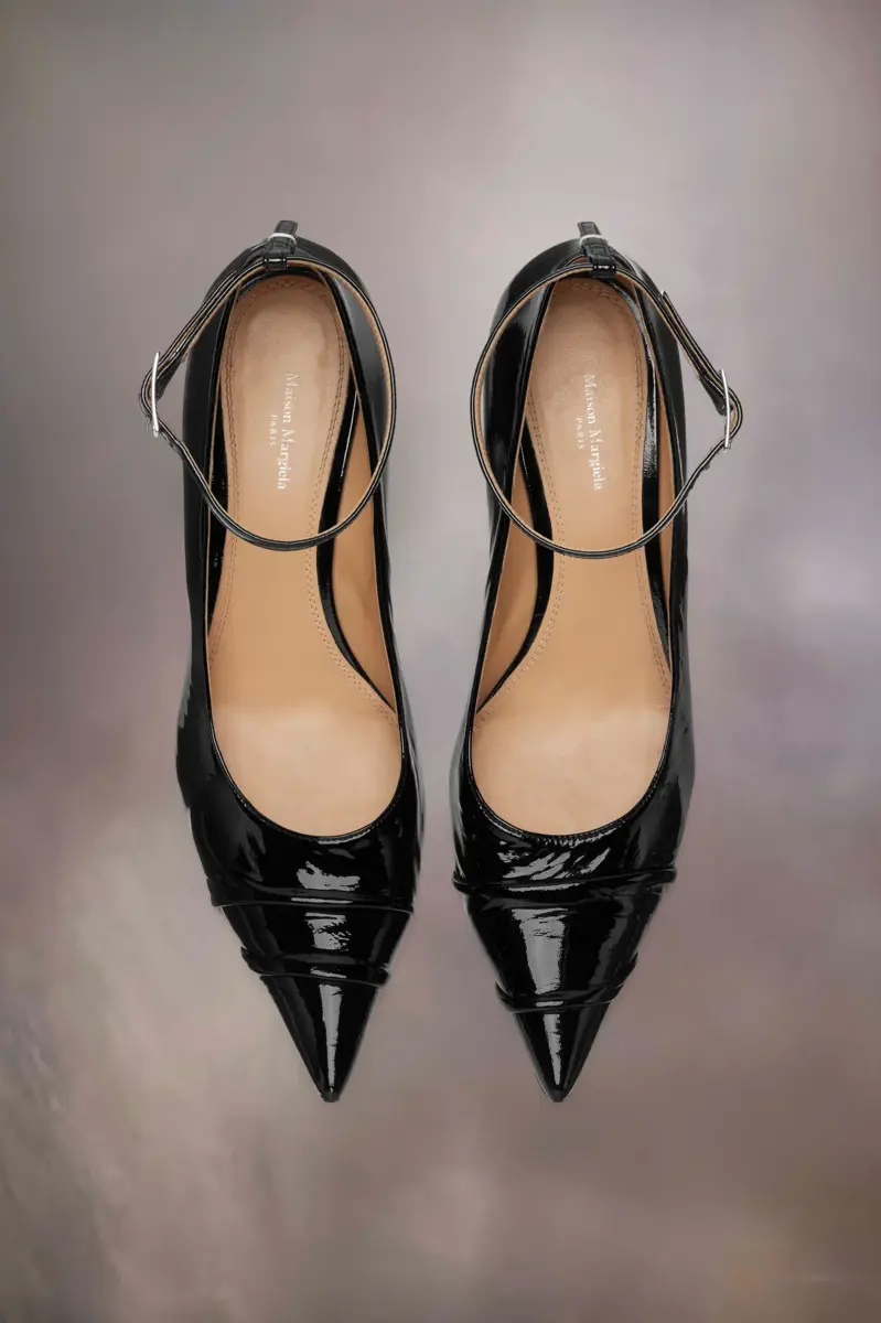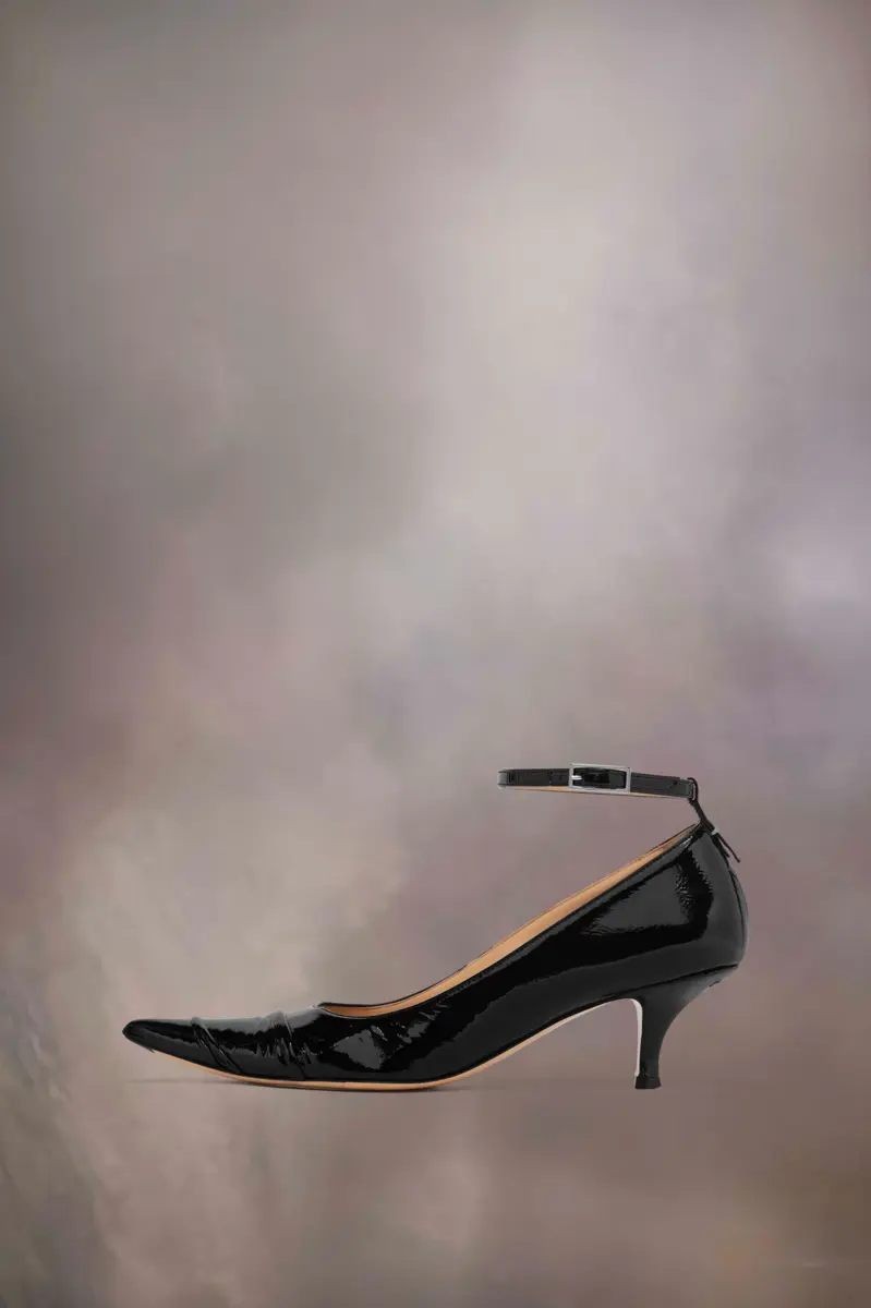 Representing the unusual or eccentric, the Maison’s Kinkies pump is a new ladylike shoe silhouette with punk attitude. Crafted from supple lambskin, with a soft and slightly swollen texture alongside its patent finish, the pumps feature handmade pleats for a luxurious touch, and a 5.5cm heel. They are reinforced with rubber at the toe for longevity, and are complete with an adjustable ankle strap. Maison Margiela’s signature stitch appears at the back; the opposite of a label.