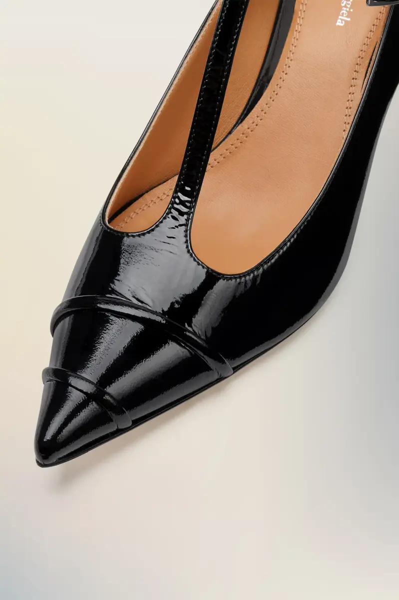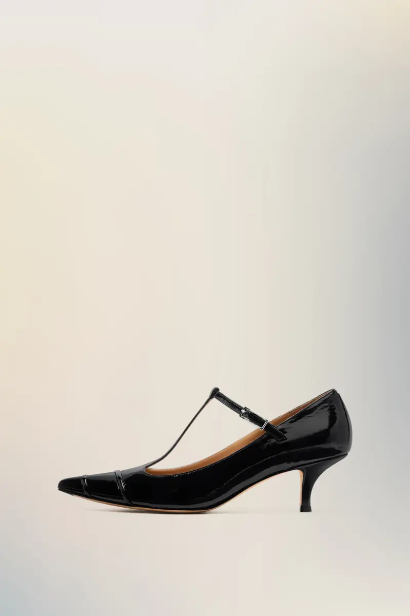 The ladylike form of the Kinkies T-bar is crafted from patent lambskin with a swollen texture and hand-pleated detailing at the toe. The slim heel and strap offer a sense of structure, while a rubber insert at the toe ensures longevity. A classic silhouette with punk attitude. Maison Margiela’s signature single white stitch appears at the back.
