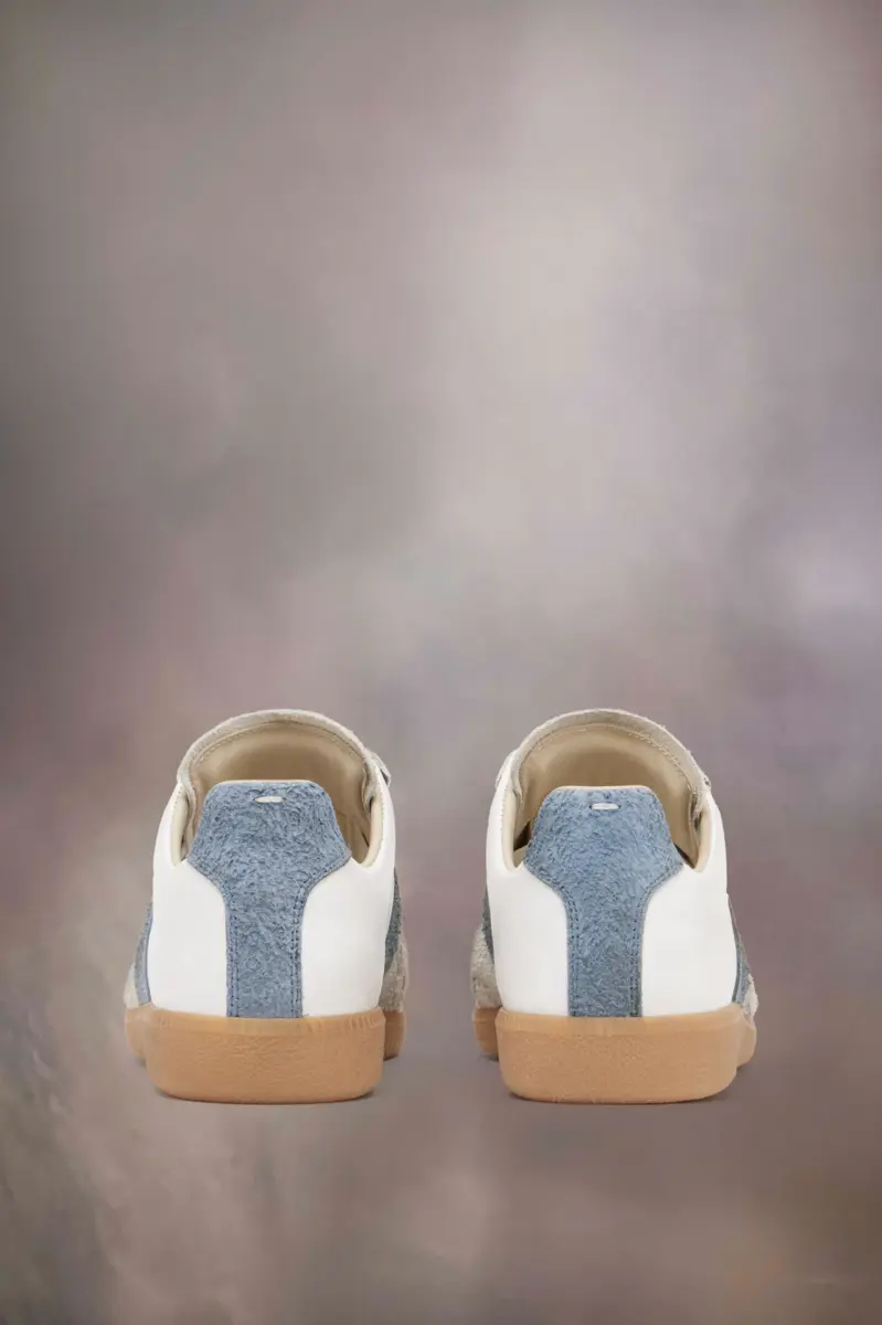 The Replica sneakers in calf leather and hairy suede with vintage treatment are supported by a classic rubber sole. The Maison’s iconic Replica model is inspired by Austrian sports shoes from the seventies. Details on the Replica pairs are continually reworked in line with the season’s inspirations. Maison Margiela’s signature white stitch appears at the back.