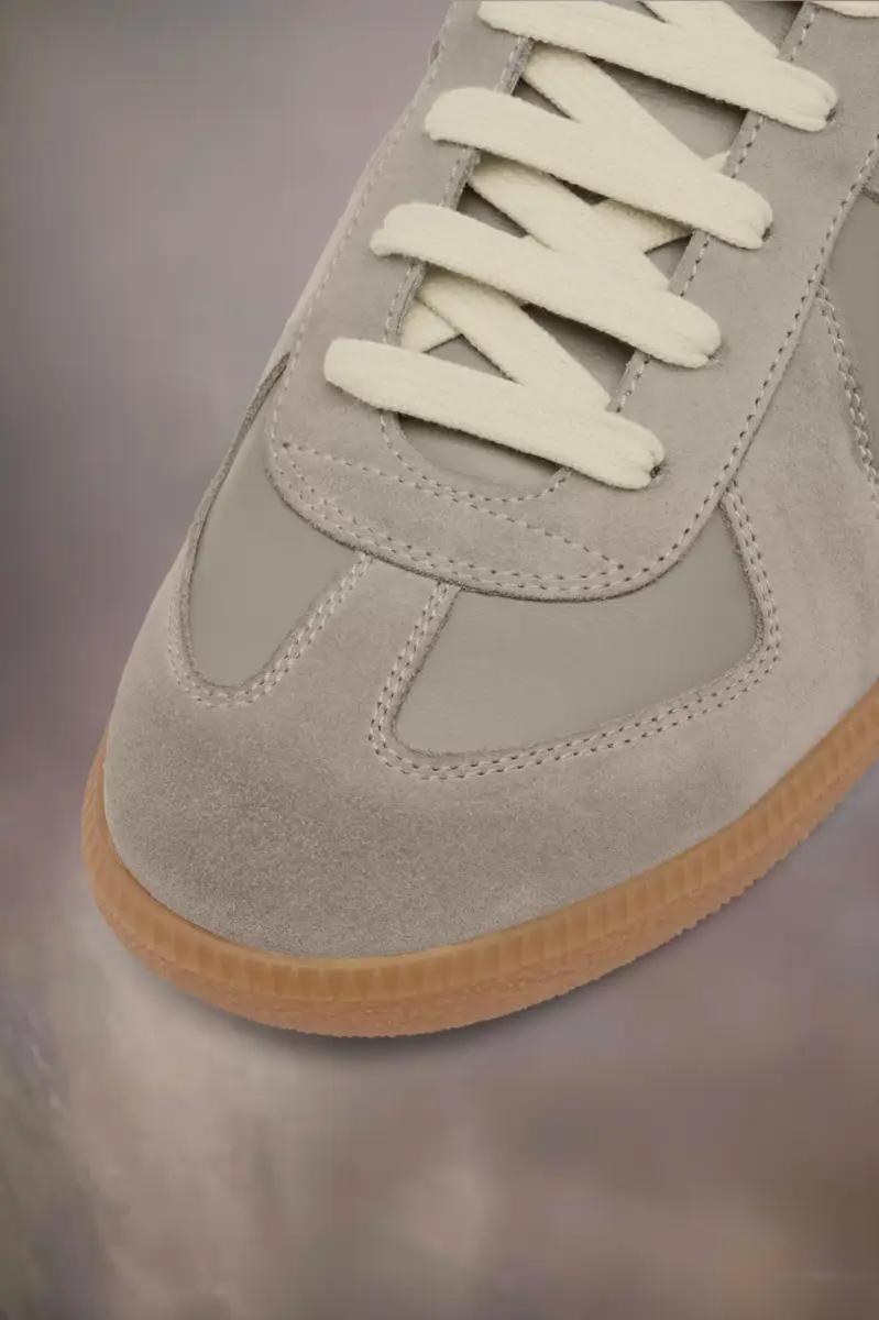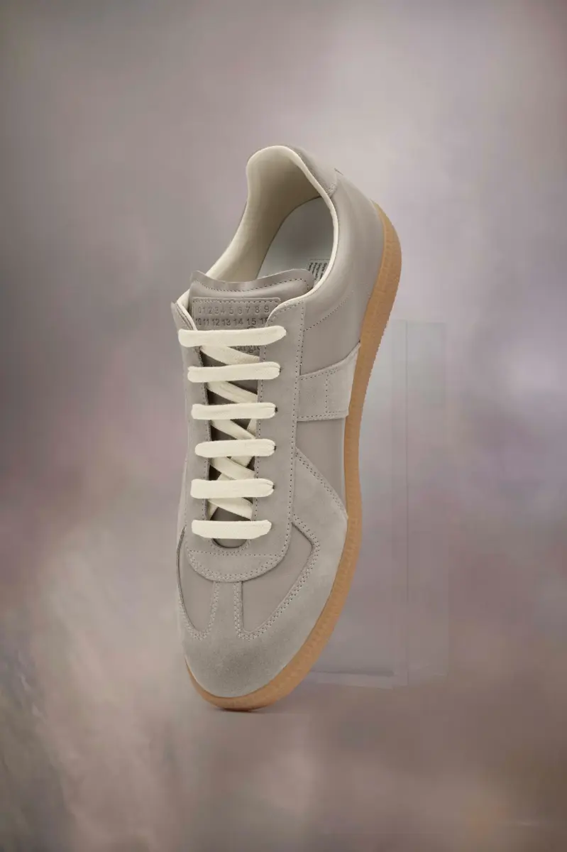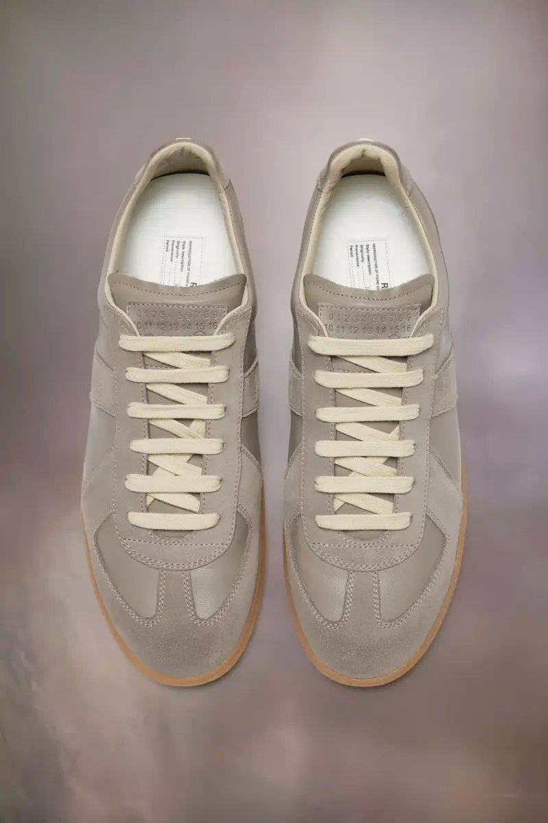 The Replica sneakers in nappa leather and suede with a honey sole. The Maison’s iconic Replica sneakers are inspired by Austrian sports shoes from the seventies. Details on the Replica pairs are continually reworked in line with the season’s inspirations.
