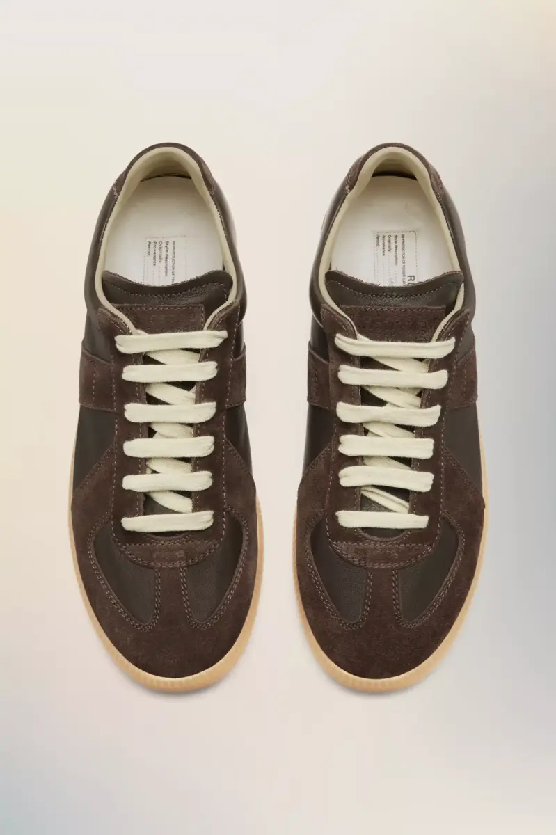 The Replica sneakers in nappa leather and suede with a honey sole. The Maison’s iconic Replica sneakers are inspired by Austrian sports shoes from the seventies. Details on the Replica pairs are continually reworked in line with the season’s inspirations.