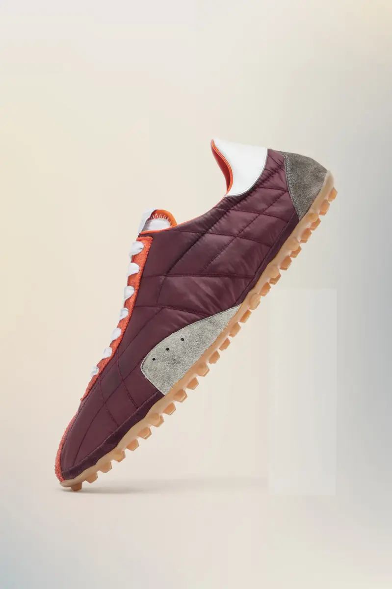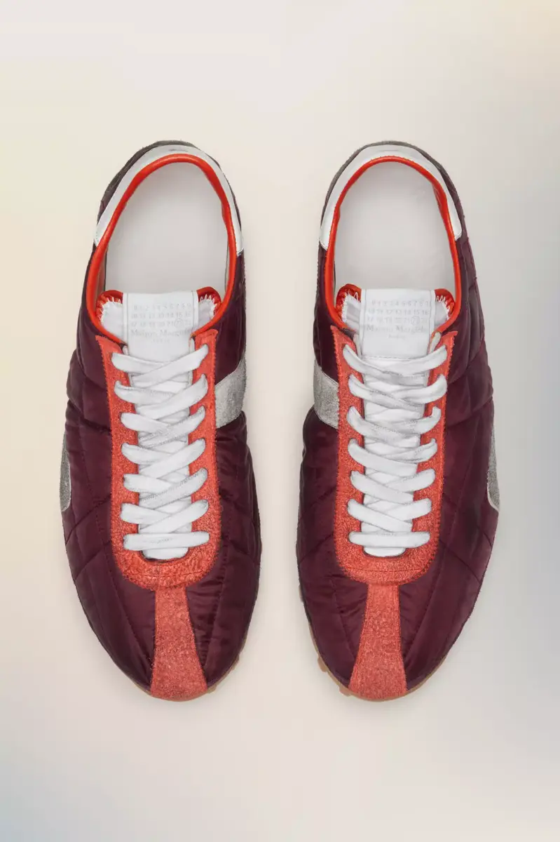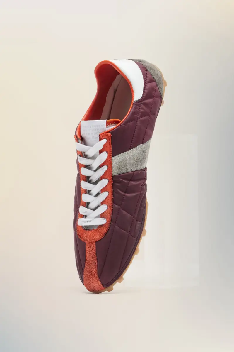 The Sprinters revisit 1960s spike shoes with a vintage-treated finish and exaggerated tactility. Crafted in hairy suede and calfskin, the design recalls town and countryside staples with quilted panels and a bold heel tab. The cleated sole includes numeric detailing, with 22 circled to indicate the Maison’s footwear collection. The tongue bears the numeric logo, while Maison Margiela’s signature single white stitch appears at the back.
