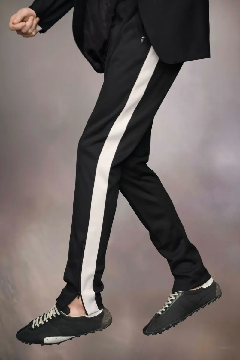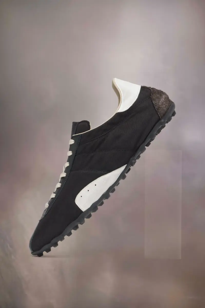 Crafted from drill, hairy suede and calfskin with a vintage treatment, the Sprinters silhouette is inspired by retro running shoes. Block colour contrast is met with the classic tongue displaying the numeric logo. The studded base also features number detailing with the 22 encircled indicating the Maison’s footwear collection. Maison Margiela’s signature stitch appears at the back; the opposite of a label.